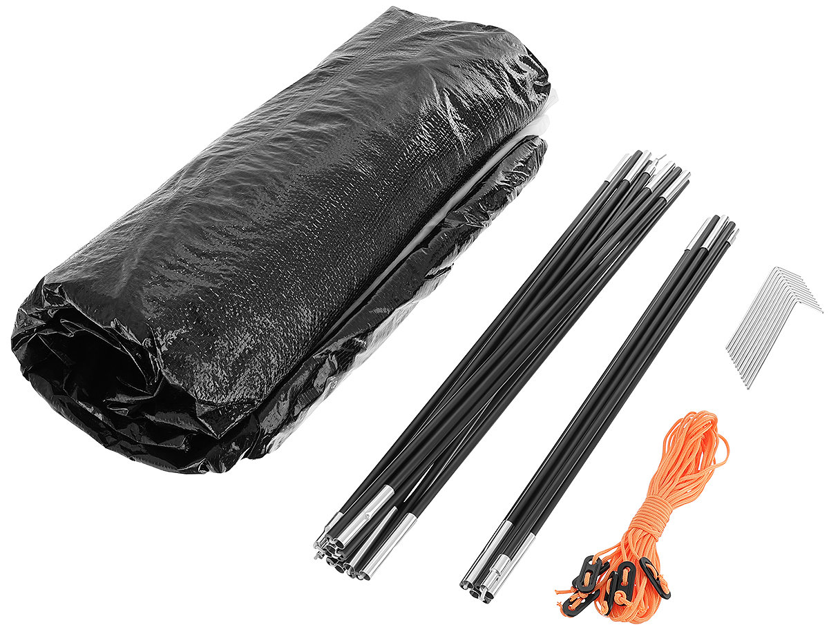 - Materiał: tropik poliester 190T z impregnacją PU, materiał namiotu poliester 170 T zaimpregnowany PA + moskitiera poliester, podłoga Polietylen 120 g/m2, stelaż włókno szklane i tworzywo sztuczne