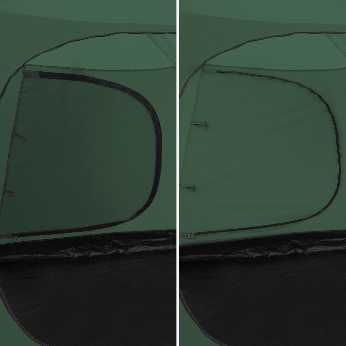 Sypialnia, która posiada otwór wentylacyjny w suficie wykonana jest z oddychającego materiału, co zapobiega skraplaniu się pary wodnej. Natomiast obydwa wejścia do sypialni możemy zamknąć moskitierą. Dodatkowo w przedsionku znajduje się duże, główne wejście. Wszystko to razem sprawia, że przewiewność i cyrkulacja powietrza jest na wysokim poziomie, co przekłada się na długi i komfortowy sen.