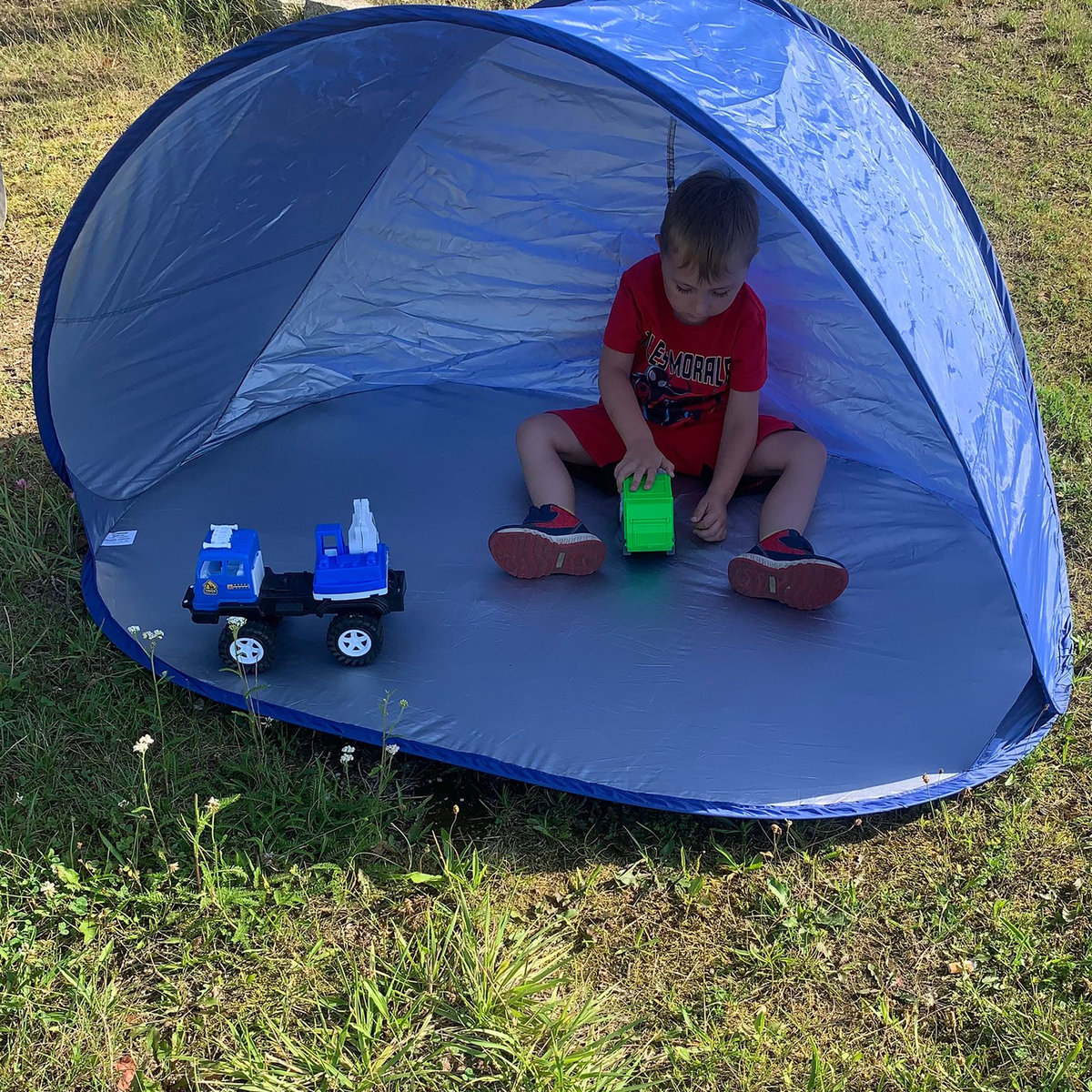 Namiot plażowy, półotwarty POP UP - chroni przed wiatrem i nadmiernym słońcem, a od spodu przed wilgocią i piaskiem na plaży. Powłoka namiotu znakomicie zabezpiecza przed szkodliwym promieniowaniem UV.