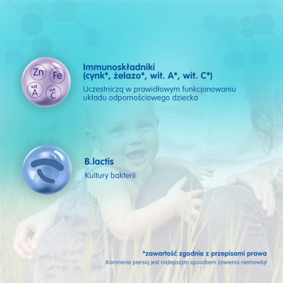 Laktoza (z mleka), oleje roślinne (olej słonecznikowy, olej kokosowy, olej rzepakowy), izolat białka serwatkowego (z mleka), koncentrat białka serwatkowego (z mleka), glicerofosforan wapnia, fosforan wapnia, cytrynian potasu, chlorek wapnia, chlorek magnezu, L-arginina, cytrynian sodu, olej rybi, Lhistydyna, olej z Mortierella alpina, witaminy (C, kwas pantotenowy, niacyna, E, B2, A, B1, B6, kwas foliowy, K, biotyna, D, B12), L-tyrozyna, chlorek sodu, siarczan żelaza (II), siarczan cynku, kultury bakterii Bifidobacterium lactis, siarczan miedzi (II), siarczan manganu, jodek potasu, selenian (VI) sodu.