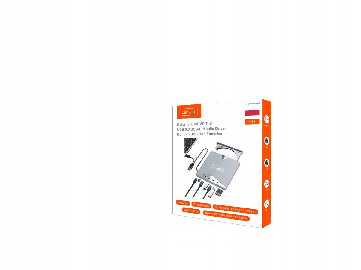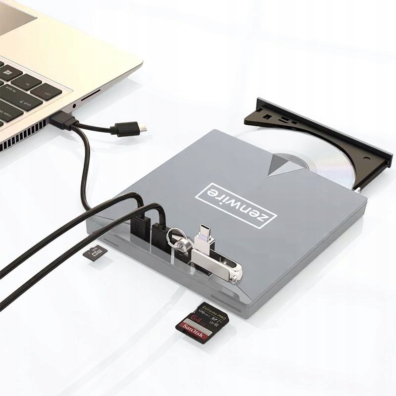 PRZENOŚNY NAPĘD ZEWNĘTRZNY Zenwire 7w1 USB 2.0 NAGRYWARKA PŁYT CD/DVD z USB-C z funkcją huba USB oraz czytnika kart SD/MICRO SD.