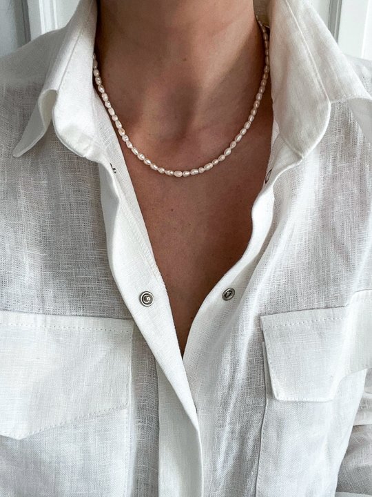 Naszyjnik z pereł to dodatek, który zawieszony na szyi doda Ci elegancji i blasku. Stworzony z absolutnie naturalnych pereł, przez lokalnego rzemieślnika z wyspy Bali. Regulowane zapięcie pozwala dostosowywać jego długość. Dzięki temu może być używany jako przylegający choker z pereł lub luźno opadający naszyjnik. Jest to dodatek na tyle uniwersalny, że będzie świetnie pasował do eleganckich kreacji, ale dobrze sprawdzi się też w luźnym plażowym looku. Jeśli chcesz stworzyć komplet, sprawdź nasz zestaw biżuterii z pereł gdzie znajdziesz także idealnie pasującą bransoletkę. Naturalne perły w buddyzmie traktowane są jako talizmany spełniające życzenia. Naszyjnik z pereł naturalnych to także dobry pomysł jako gustowny prezent dla bliskiej Ci osoby. Choker z pereł jest produktem w 100% naturalnym. Jego naturalny charakter sprawia, że perełki mają piękne, nieregularne kształty. Każdy z nich został wykonany ręcznie na wyspie Bali. Opis: Naszyjnik z pereł Skład: Perły hodowlane Rozmiar: 37cm + 8cm regulowany łańcuszek