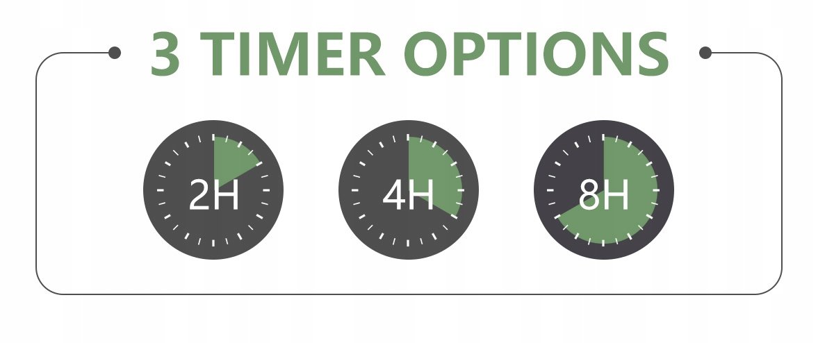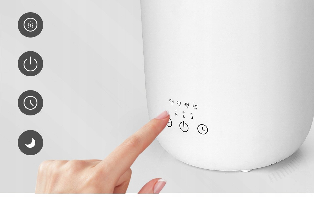 Nawilżacz posiada również funkcję timera. Timer można ustawić na 2 godziny, 4 godziny lub 8 godzin. Misty wyłącza się automatycznie po upływie ustawionego czasu.