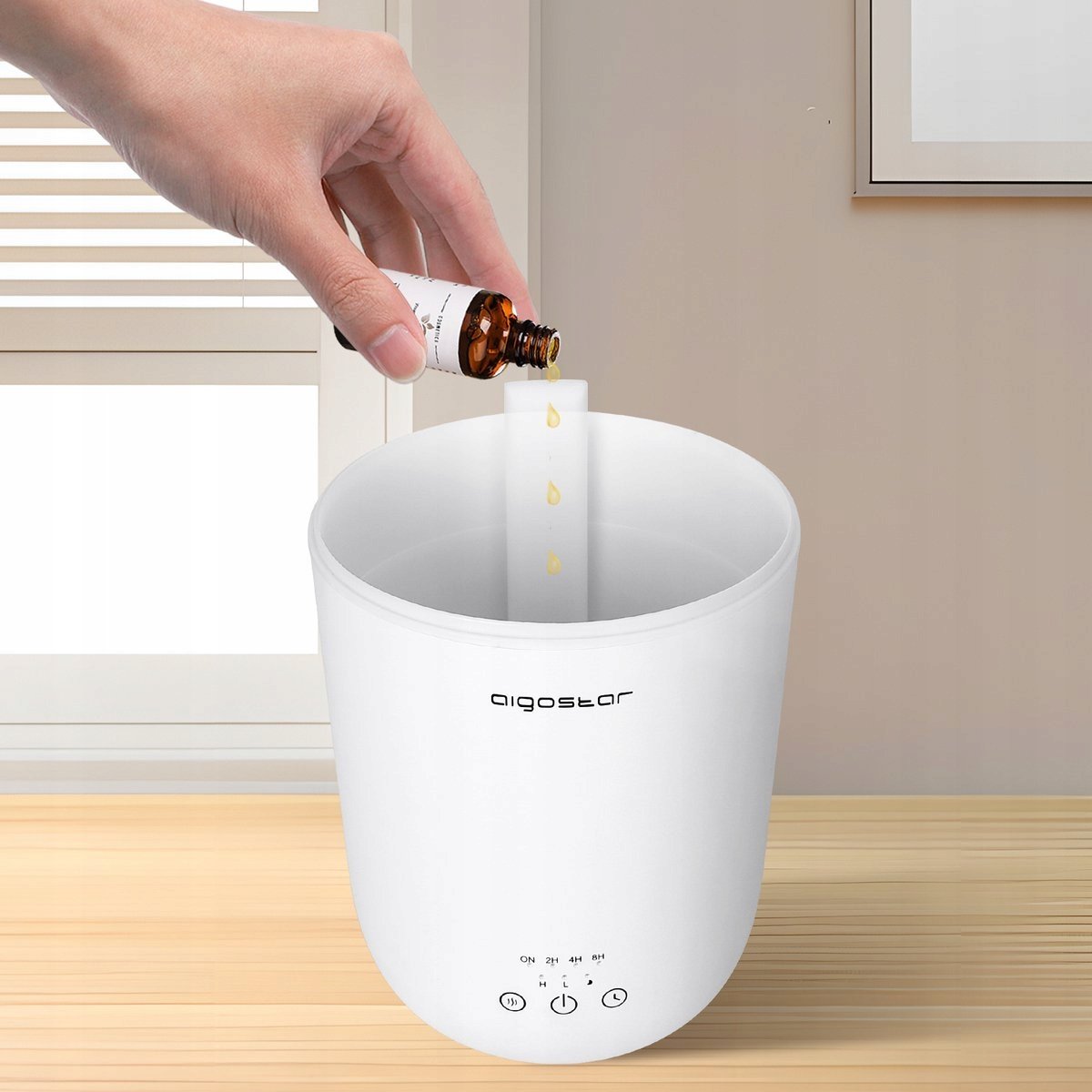 Nawilżacz Aigostar Misty ma pojemność 2,2 litra. Przy najniższym ustawieniu może nawilżać pomieszczenie przez 20 godzin. Zawsze napełniaj zbiornik na wodę czystą wodą i wymieniaj ją codziennie. Dokładnie wyczyść urządzenie, aby zapobiec rozwojowi mikroorganizmów. Jeśli nie ma wystarczającej ilości wody, urządzenie wyłącza się automatycznie. W razie potrzeby dodaj trochę olejków eterycznych podczas stosowania, aby uzyskać przyjemniejszą atmosferę.