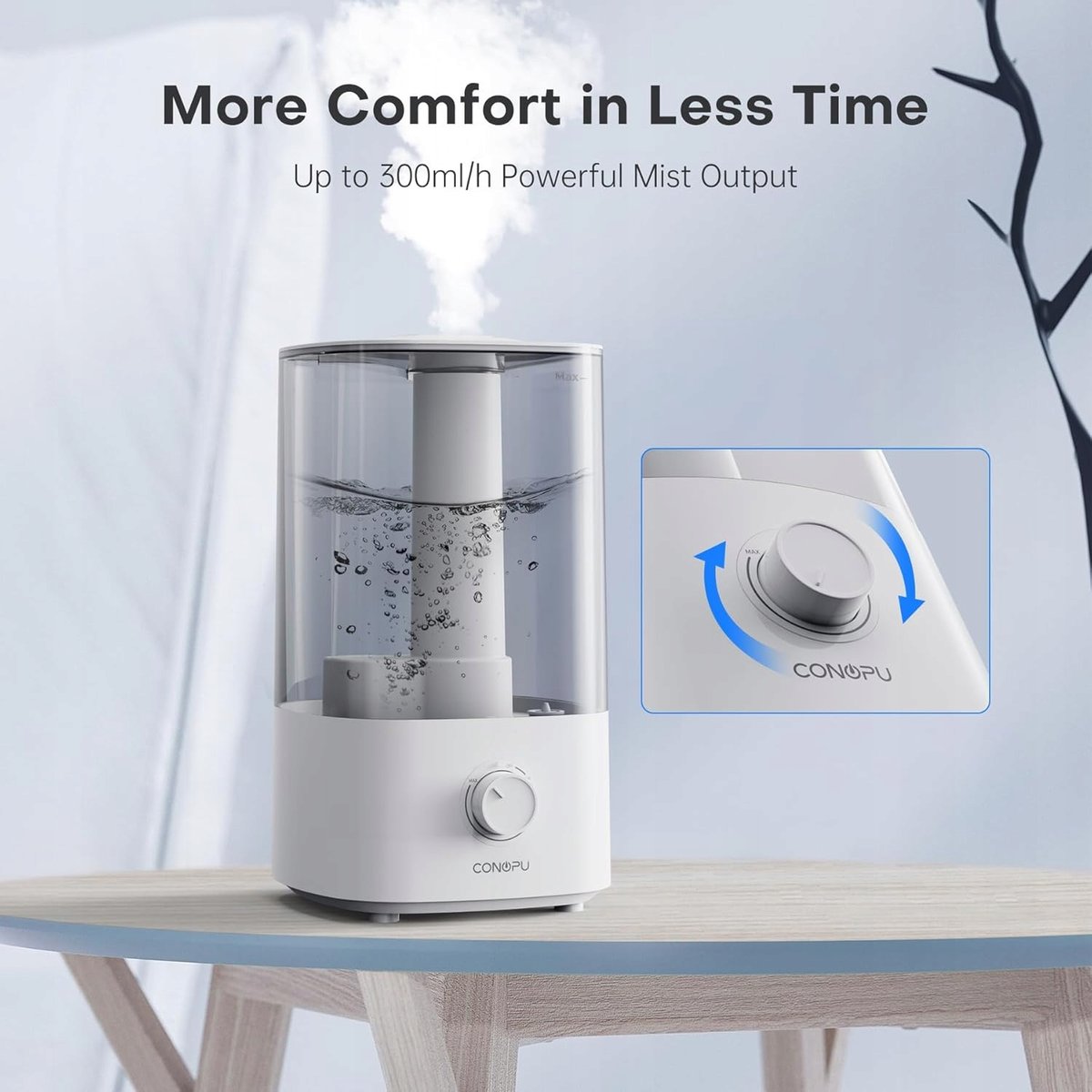 nawilżacze powietrza CONOPU są w stanie emitować do 300 ml/h mgiełki i szybko podnieść wilgotność do 50%-80%, aby skutecznie złagodzić suchość i objawy kaszlu i suchości w gardle. A dzięki dużej objętości mgiełki jest w stanie pokryć duże pomieszczenie o powierzchni 20㎡, utrzymując w całym pomieszczeniu zdrowy poziom wilgotności. Aby zapewnić długotrwałe działanie i wydajność nawilżacza, zalecamy używanie czystej wody do uzupełniania