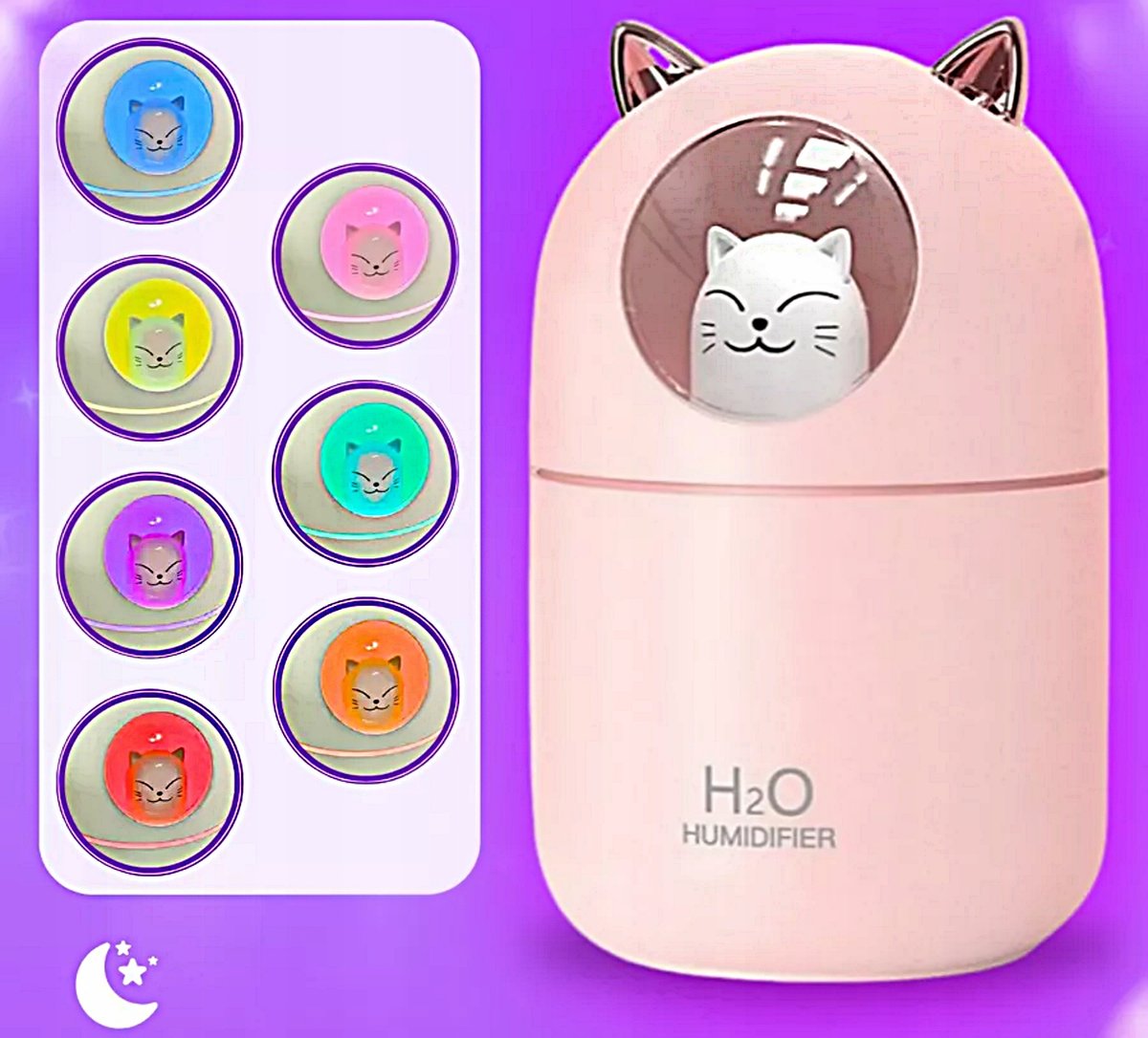 NAWILŻACZ POWIETRZA DYFUZOR LAMPKA NOCNA CICHA PRACA KOT KOTEK DLA DZIECI✨✨✨✨✨Najważniejsze cechy:✅ Atrakcyjny design w kształcie owalnego kota✅ Funkcja lampki nocnej - lampka LED✅ 7 trybów ...