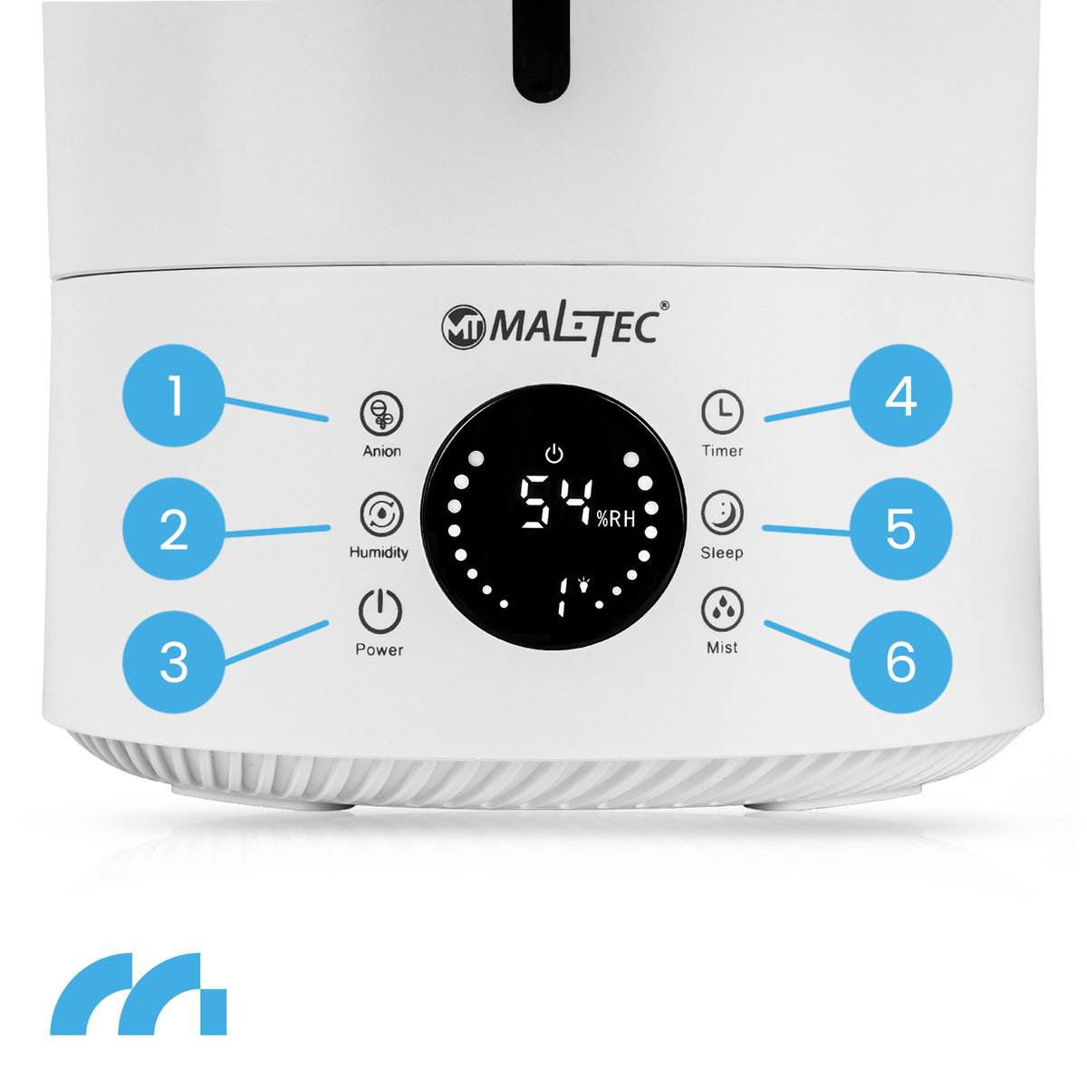 Wyświetlacz informuje o aktualnej wilgotności i temperaturze w pomieszczeniu, braku wody, ustawieniach timera oraz poziomie intensywności rozpylania mgły.