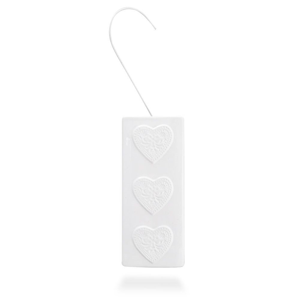 CERAMICZNY - Wykonany z wysokiej jakości ceramiki w kolorze białym. Posiada błyszczące wykończenie i efektowne zdobienie z motywem serc. Zawieszany na metalowym haczyku w kolorze białym.
