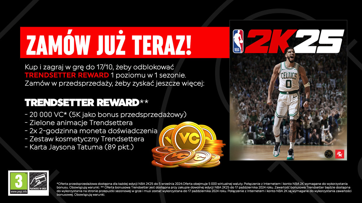 Kup i zagraj w grę do 17.10, aby otrzymać bezpłatnie nagrodę poziomu 1 w sezonie 1 (Trendsetter Reward*), w tym 15 000 w walucie wirtualnej i inne dodatki do trybów MyCAREER i MyTEAM!