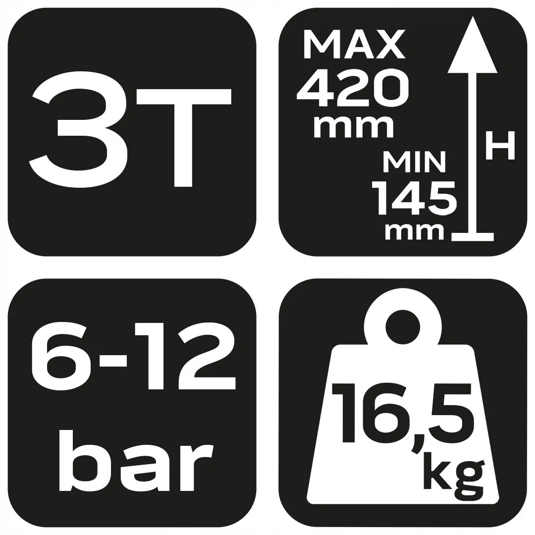 Podnośnik typu bałwanek obsługuje maksymalny udźwig do 3 ton i oferuje zakres wysokości od 145 do 420 mm. Dzięki niskiemu profilowi umożliwia łatwe wsunięcie pod większość aut, także tych z niskim zawieszeniem.