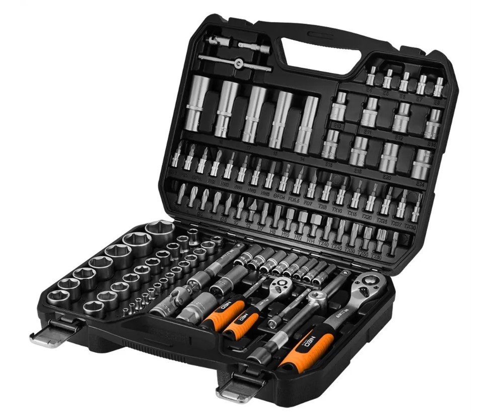 Zestaw kluczy 110 elementów ½” ¼” 10-211 marki NEO TOOLS to kompleksowy pakiet narzędzi w rozmiarze ½” oraz ¼” z satynowym wykończeniem, umieszczonych w wygodnej walizce z tworzywa sztucznego z zatrzaskami oraz komfortową w obsłudze rękojeścią.
