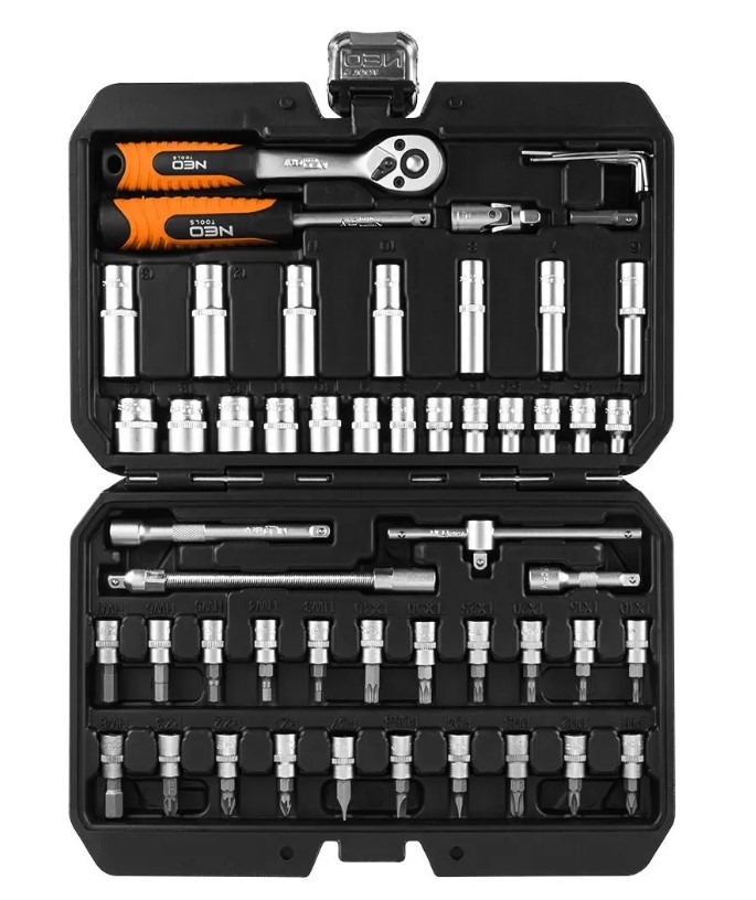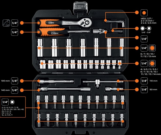 Zestaw kluczy 55 elementów ¼” 10-201 marki NEO TOOLS to niezbędny pakiet narzędzi w rozmiarze ¼”, umieszczonych w wygodnej walizce z tworzywa sztucznego.