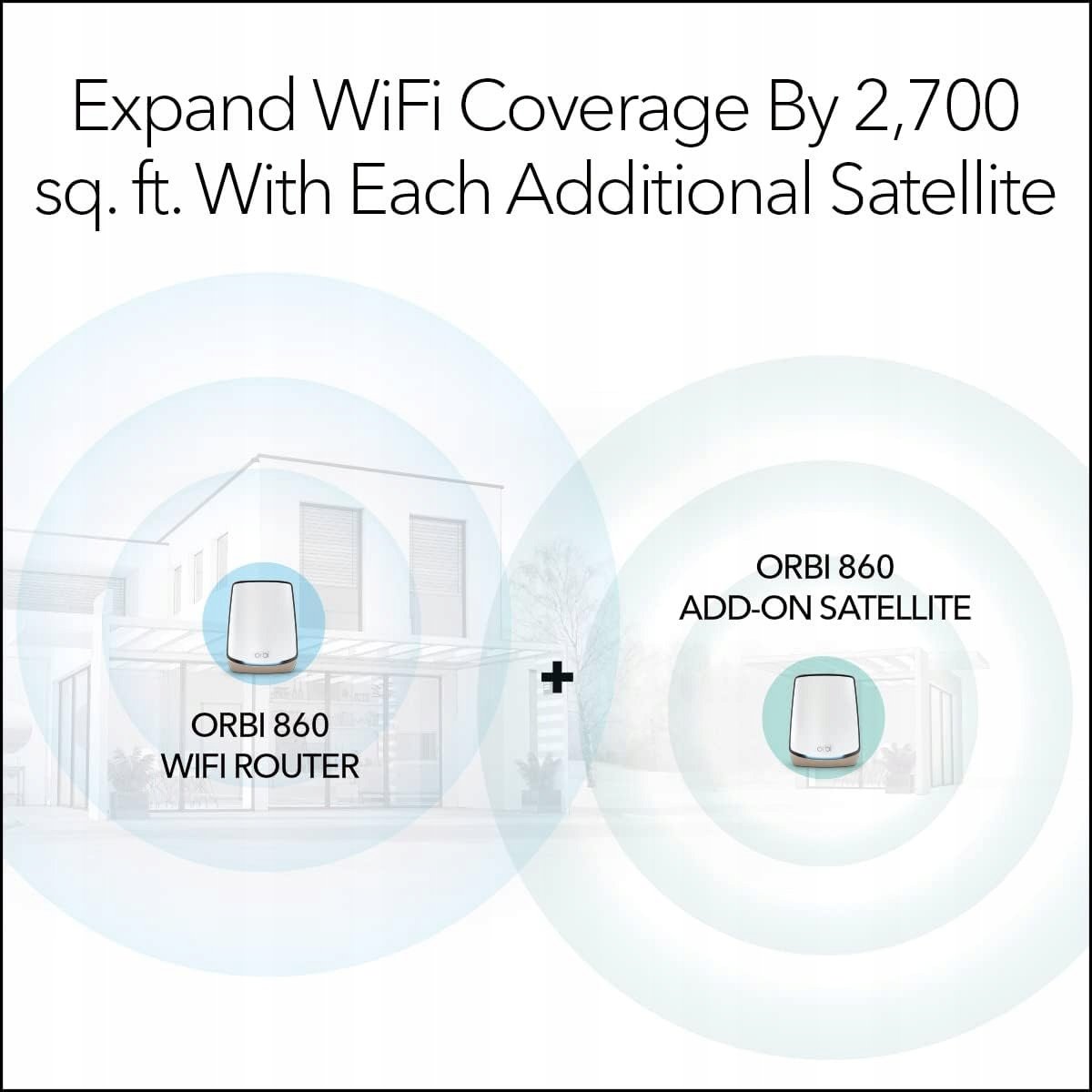 Rozszerz zasi��g sieci WLAN jednym naci��ni��ciem przycisku, dodaj��c satelit�� Orbi 860 (sprzedawany oddzielnie), przygotuj swoj�� sie�� Wi-Fi na przysz��o���� dzi��ki opatentowanej siatce Orbi Mesh