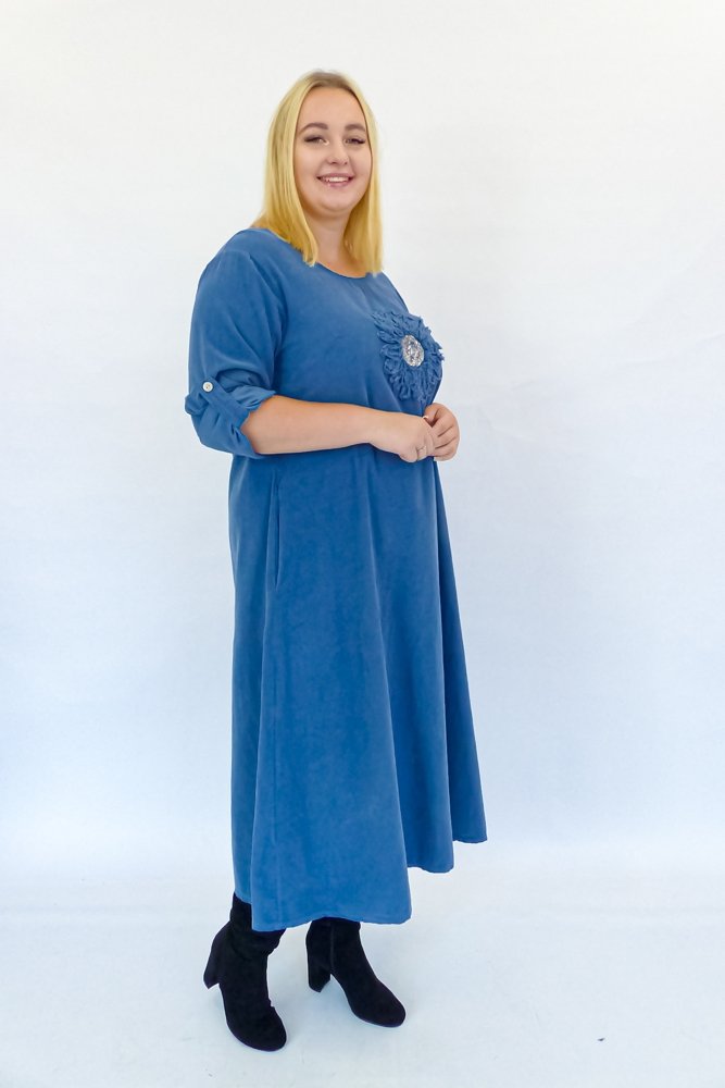 Niebieska sztruksowa sukienka z kwiatem to doskonały wybór na różne okazje, który łączy w sobie klasykę z nowoczesnym stylem, zapewniając komfort i modny wygląd.