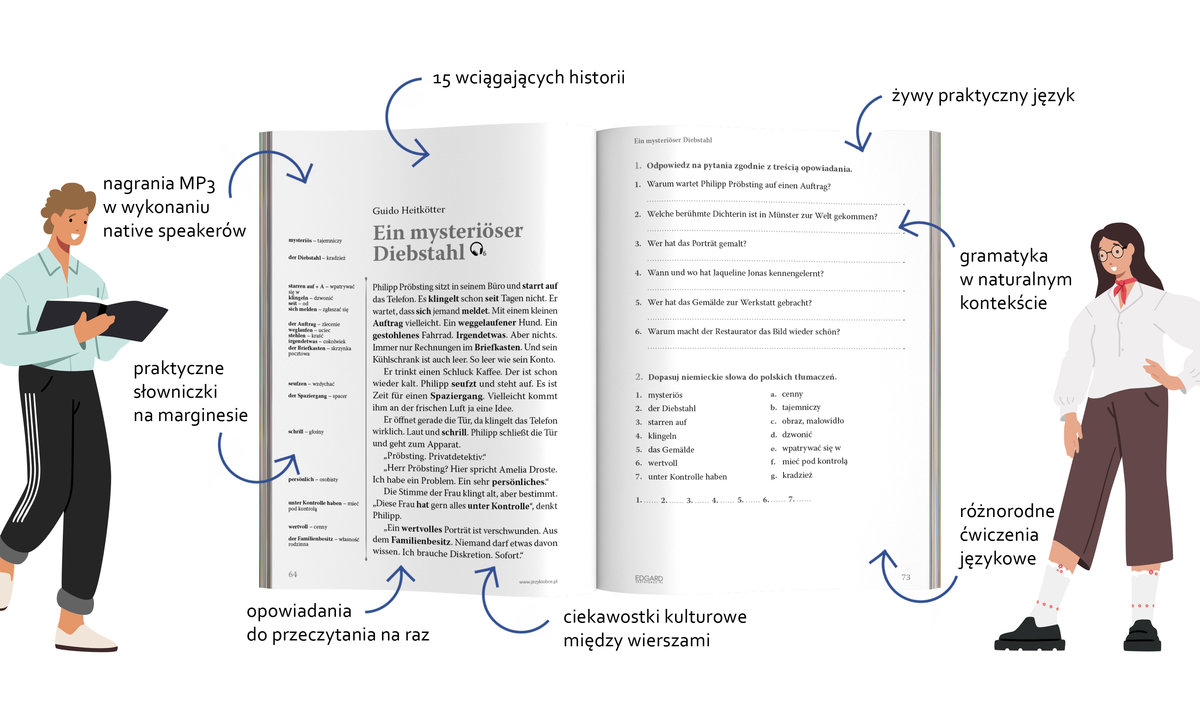 Dzięki wciągającej fabule oraz żywemu językowi poznasz powszechnie używane kolokwializmy i struktury gramatyczne w kontekście, opanujesz nowe słownictwo i kolokacje charakterystyczne dla naturalnego, współczesnego języka niemieckiego i bez trudu zrozumiesz niuanse i różnice kulturowe. To co, czas na niemiecki? Z przyjemnością!