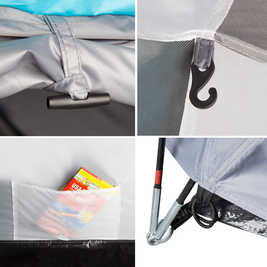 Namiot jest wyposażony w dwie wewnętrzne kieszenie, w których schowamy podręczne rzeczy oraz uchwyt pod sufitem, dzięki któremu możemy zawiesić lampkę.
