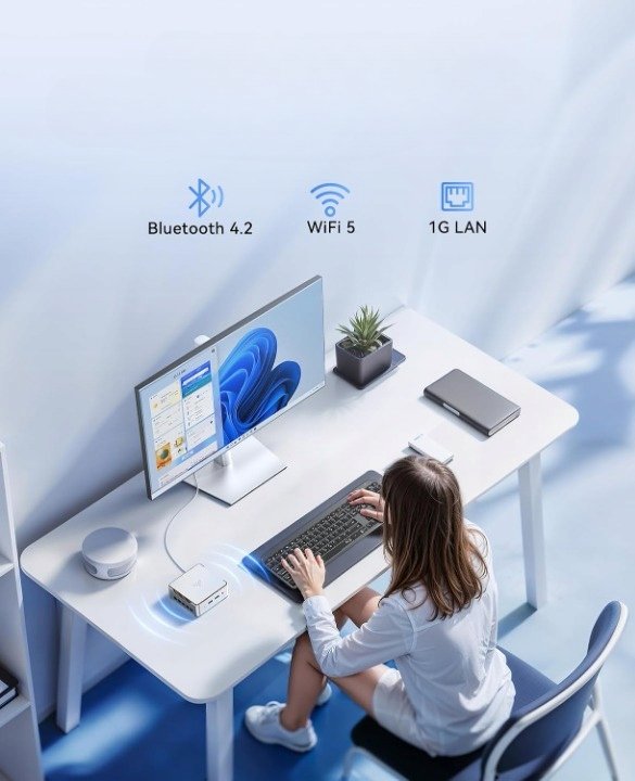 - Stabilna i szybka sieć Wi-Fi Mini PC jest wyposażony w dwupasmowe WiFi 5 2,4 G + 5G i zapewnia mocniejszy i bardziej stabilny sygnał Wi-Fi, który zapewnia płynną pracę usług online, zakupów online, filmów i innych prac online. Bluetooth 4.2 umożliwia bezprzewodowe połączenie wielu urządzeń. Port Gigabit Ethernet zapewnia bezpieczny i szybki dostęp do Internetu dla dużych plików do pobierania plików, stabilnych spotkań grupowych online, zastosowań przemysłowych i komercyjnych.