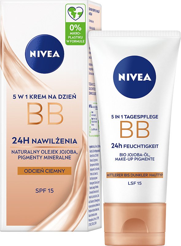 NIVEA 5w1 Krem BB na Dzień - Ciemny, 50 mlNIVEA Krem BB 5 w 1 na dzień z naturalnym Olejkiem Jojoba i mineralnymi pigmentami intensywnie nawilża skórę do 24 godzin. Koloryzujący krem na dzień do ...