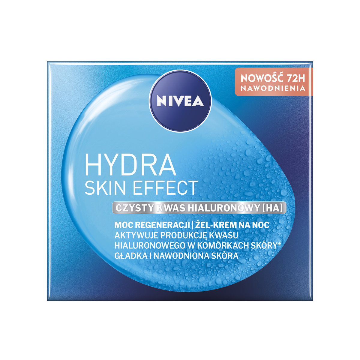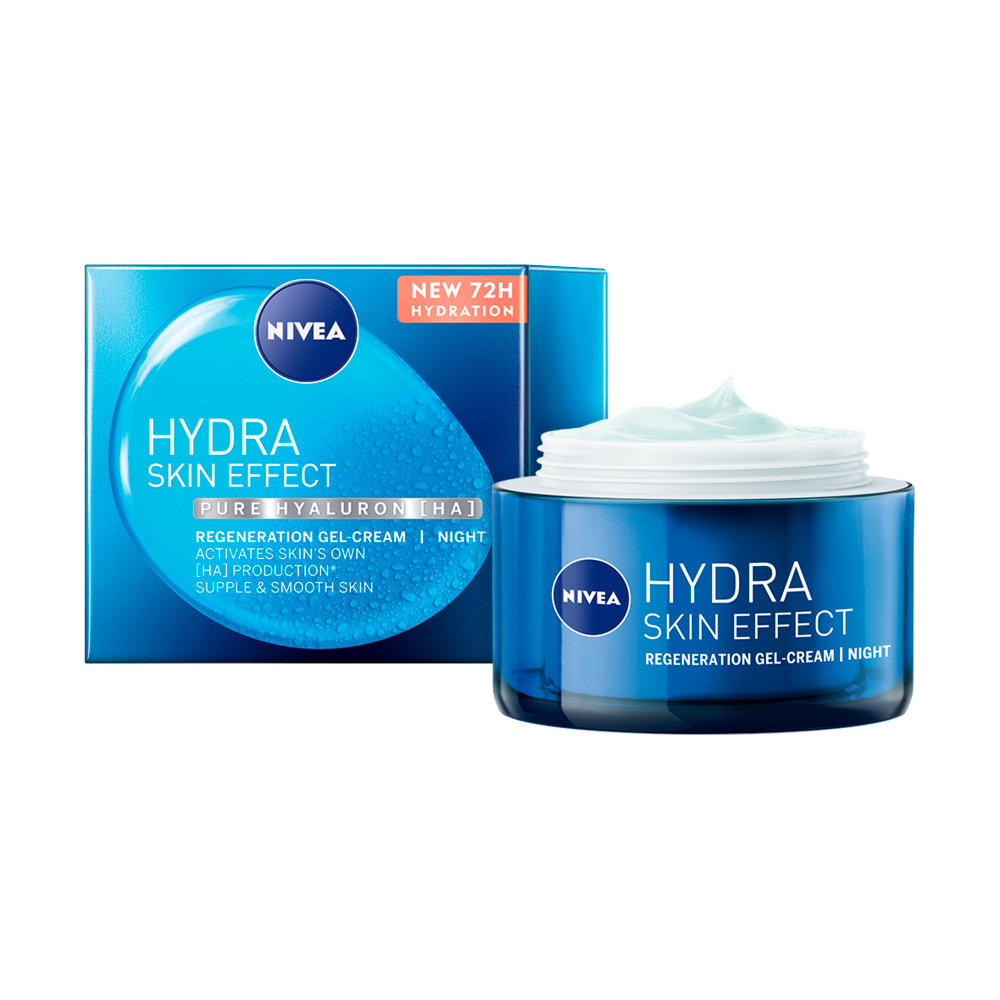 NIVEA® HYDRA SKIN EFFECT Moc Regeneracji Żel-Krem na Noc z czystym kwasem hialuronowym [HA] natychmiastowo i intensywnie nawadnia przez 72H oraz wygładza cerę, zapewniając jej długotrwałe uczucie ...