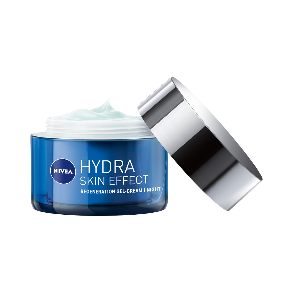 NIVEA® HYDRA SKIN EFFECT Moc Regeneracji Żel-Krem na Noc z czystym kwasem hialuronowym [HA] natychmiastowo i intensywnie nawadnia przez 72H oraz wygładza cerę, zapewniając jej długotrwałe uczucie komfortu. Skóra jest zregenerowana i sprężysta o poranku, dzięki czemu wygląda zdrowo i promiennie. Drobne linie są widocznie wygładzone, a lekka, żelowa formuła delikatnie wtapia się w skórę i nie pozostawia na niej uczucia lepkości. Odpowiedni dla każdego typu cery. Tolerancja dla skóry potwierdzona dermatologicznie.
