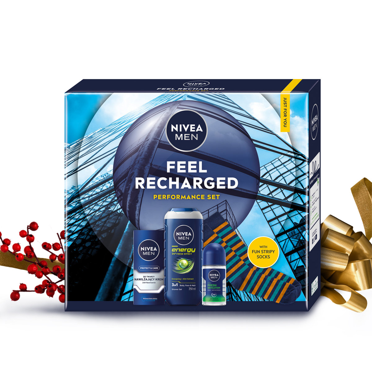 Szukasz zestawu kosmetyków dla mężczyzn na prezent? Wybierz sprawdzony świąteczny zestaw NIVEA FEEL RECHARGED do codziennej pielęgnacji ciała dla bliskiej Ci osoby! W zestawie oprócz 3 męskich kosmetyków znajdziesz również skarpetki męskie w paski oraz okolicznościową kartkę świąteczną, jako dodatek do upominku. W skład zestawu wchodzą: - NIVEA MEN FRESH SENSATION Antyperspirant roll-on, który zapewnia długotrwałą ochronę przed potem i nieprzyjemnym zapachem. - Żel pod prysznic NIVEA MEN ENERGY 3 W 1 DO CIAŁA, TWARZY I WŁOSÓW o świeżym, męskim zapachu, który zapewnia długotrwałe uczucie świeżości. - NIVEA MEN PROTECT & CARE NAWILŻAJĄCY KREM DO TWARZY, który dba o skórę i chroni ją przed wysuszeniem, zapewniając zdrowy wygląd.