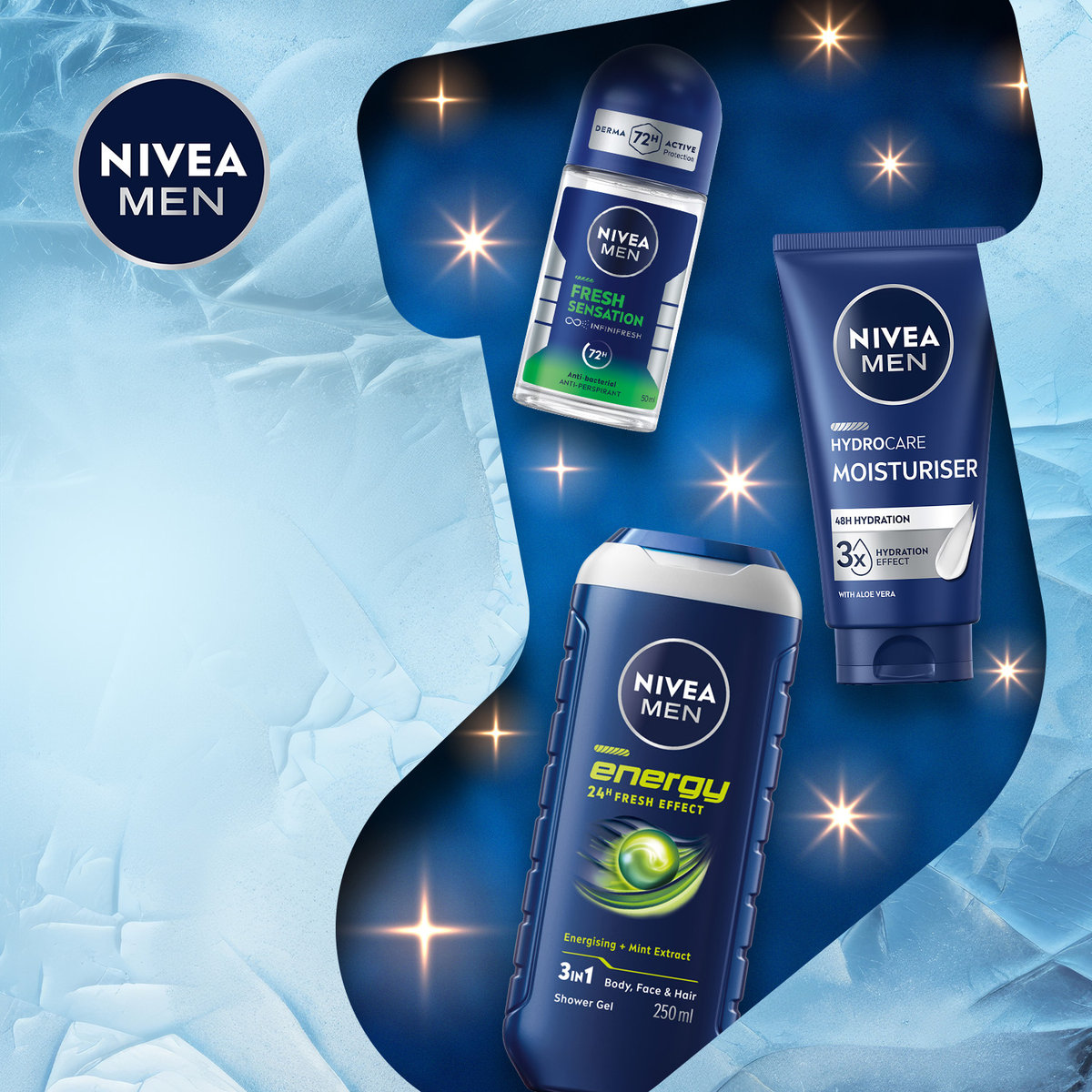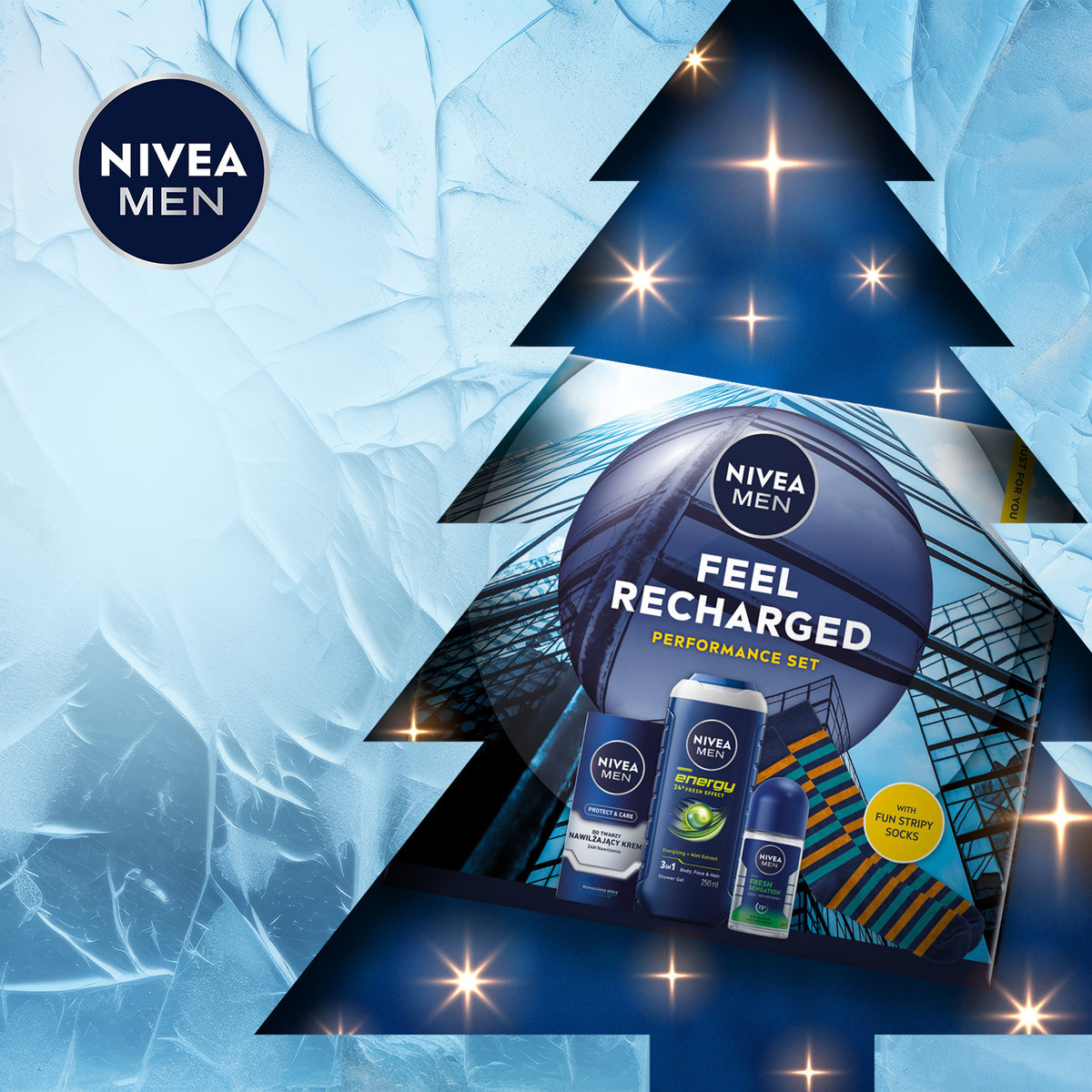 NIVEA MEN Feel Recharged Świąteczny Zestaw kosmetyków + kartka:NIVEA MEN PROTECT & CARE Nawilżający krem do twarzy, 75mlNIVEA MEN ENERGY Żel pod prysznic, 250mlNIVEA MEN FRESH SENSATION ...