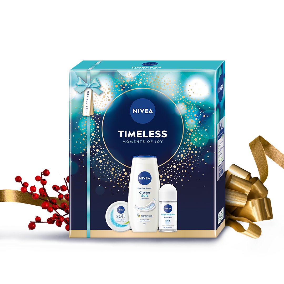Podaruj bliskiej osobie świąteczny zestaw kosmetyków dla kobiet TIMELESS i pielęgnuj magię Świąt! Zestaw zawiera żel pod prysznic, antyperspirant oraz krem do ciała, twarzy i rąk o pielęgnujących formułach, dla nawilżenia, komfortu i uczucia gładkiej skóry. To idealny zestaw kosmetyków dla kobiet zarówno dorosłych, jak i jako prezent dla nastolatki. Postaw na prezent i pielęgnację w jednym – od NIVEA. Tolerancja dla skóry potwierdzona dermatologicznie. Zestaw kosmetyków dla kobiet zawiera: - NIVEA Soft krem intensywnie nawilżający do twarzy, ciała i rąk z olejkiem jojoba i witaminą E - NIVEA Fresh Natural antyperspirant roll-on, który chroni przed nieprzyjemnym zapachem i potem - NIVEA Creme Soft żel pod prysznic z dodatkiem olejku migdałowego dla nawilżonej i gładkiej skóry. Dodatkowo do zestawu dołączamy okolicznościową kartkę świąteczną jako dodatek do prezentu.