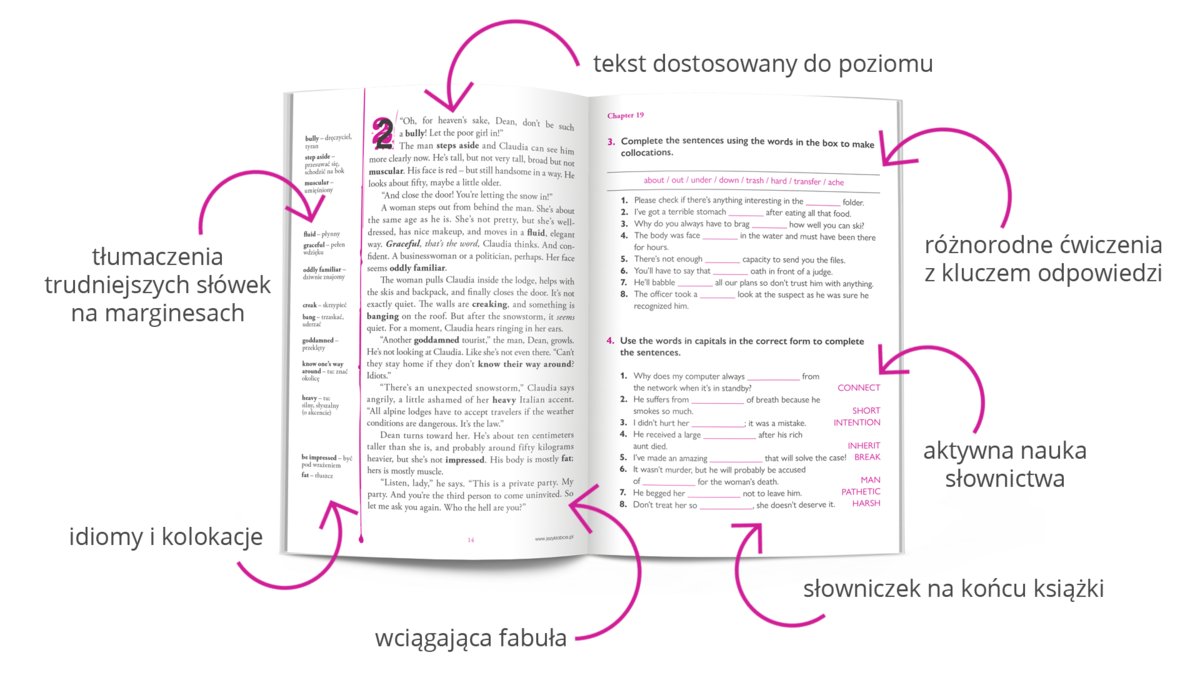 W naturalny sposób przyswajasz konstrukcje leksykalno-gramatyczne, wzbogacasz słownictwo oraz rozwijasz umiejętność czytania ze zrozumieniem, wykonując różnorodne ćwiczenia podczas lektury. A swoje odpowiedzi sprawdzasz w kluczu na końcu książki.