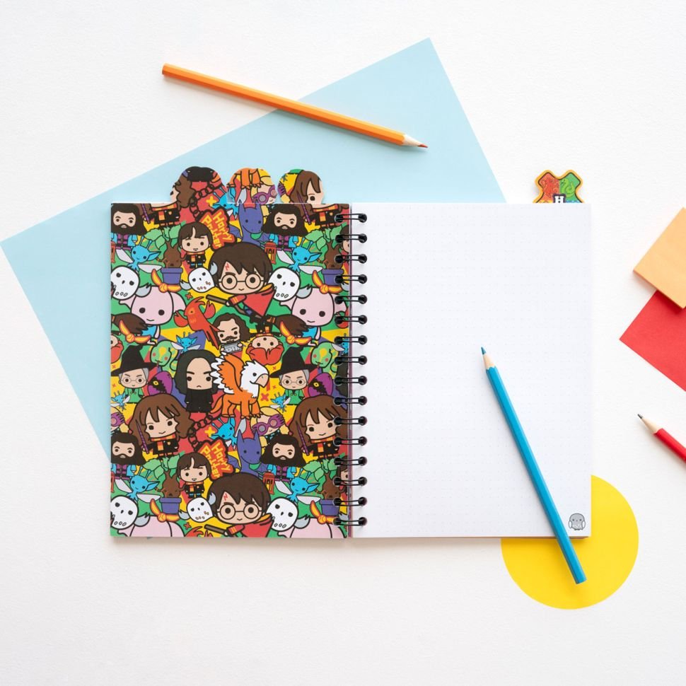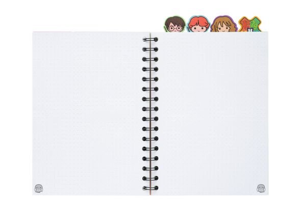 Notatnik A5 inspirowany magicznym światem Harry'ego Pottera, z matową okładką i miękką oprawą. Spiralna konstrukcja ułatwia użytkowanie, a cztery niestandardowe przekładki z grafikami z serii dodają uroku. W środku znajduje się 80 arkuszy (160 stron) papieru o gramaturze 80 g/m2, idealnych do prowadzenia notatek, szkiców i planów. To stylowy i funkcjonalny dodatek, który doskonale sprawdzi się w codziennym użytku.