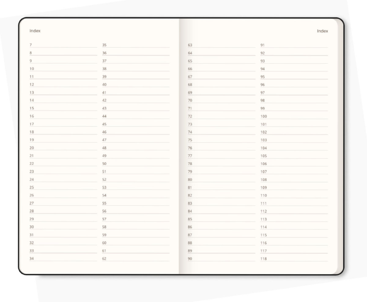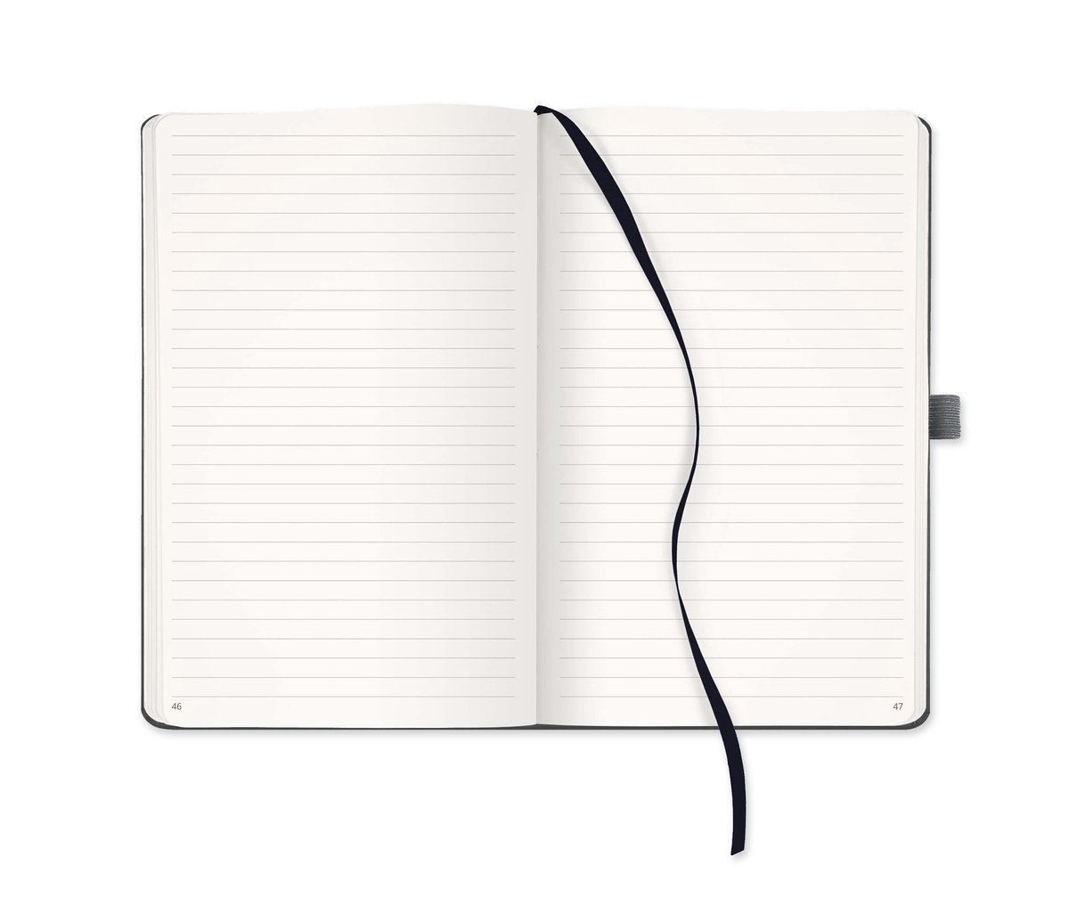 Zakładka, gumka zamykająca i penloop w kolorze adekwatnym do oprawy, ranty foliowane (kolor oprawy), zaokrąglone narożniki bloku i oprawy.