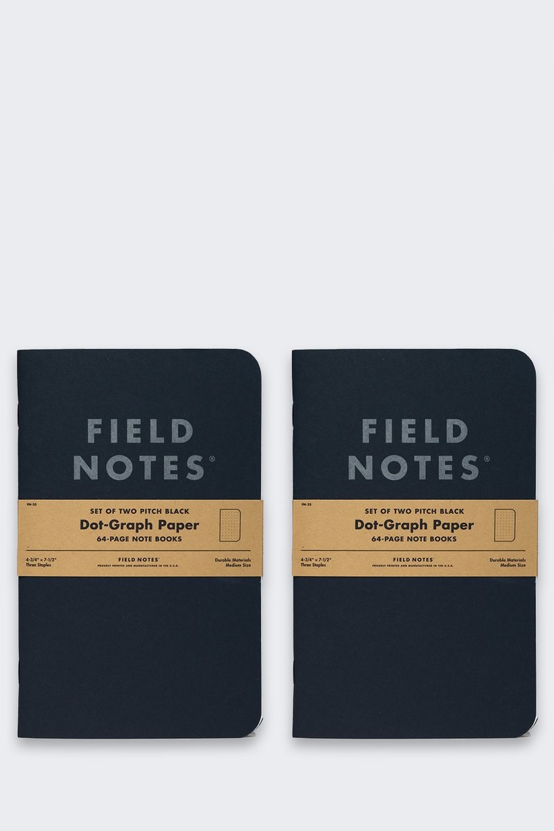 Notes Field Notes Pitch Black o wymiarach 121 mm × 191 mm i są wykonane z papieru 60# Finch Opaque. Okładki są wykonane z wytrzymałego papieru 118# od French Paper Co., z unikalnym, ekskluzywnym dla Field Notes czarno-kraftowym papierem duplex. Notatniki są zszywane błyszczącymi czarnymi zszywkami i mają dyskretnie nadrukowane logo Pitch Black na tylnej okładce.