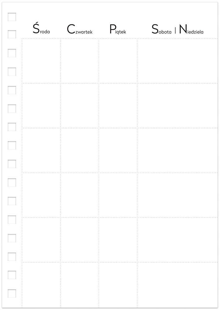 Ewenementem tych planerów są kartki w kropki – pomaga to w szybszym i estetyczniejszym rozrysowaniu schematów organizacji przestrzeni.
