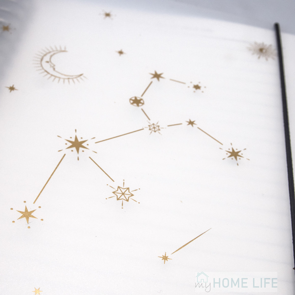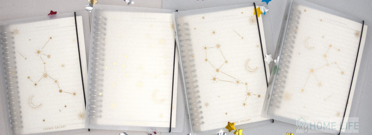 Segregator z kartkami COSMIC GALAXY wzór 4 szczegóły format B5 60 kartkowy rozmiar 17,8 x 25,8cm kartki w linę na kartkach na górze napis " LISTEN TI TIME AND WRITE LIFE" na gumce okładka twarda, ...