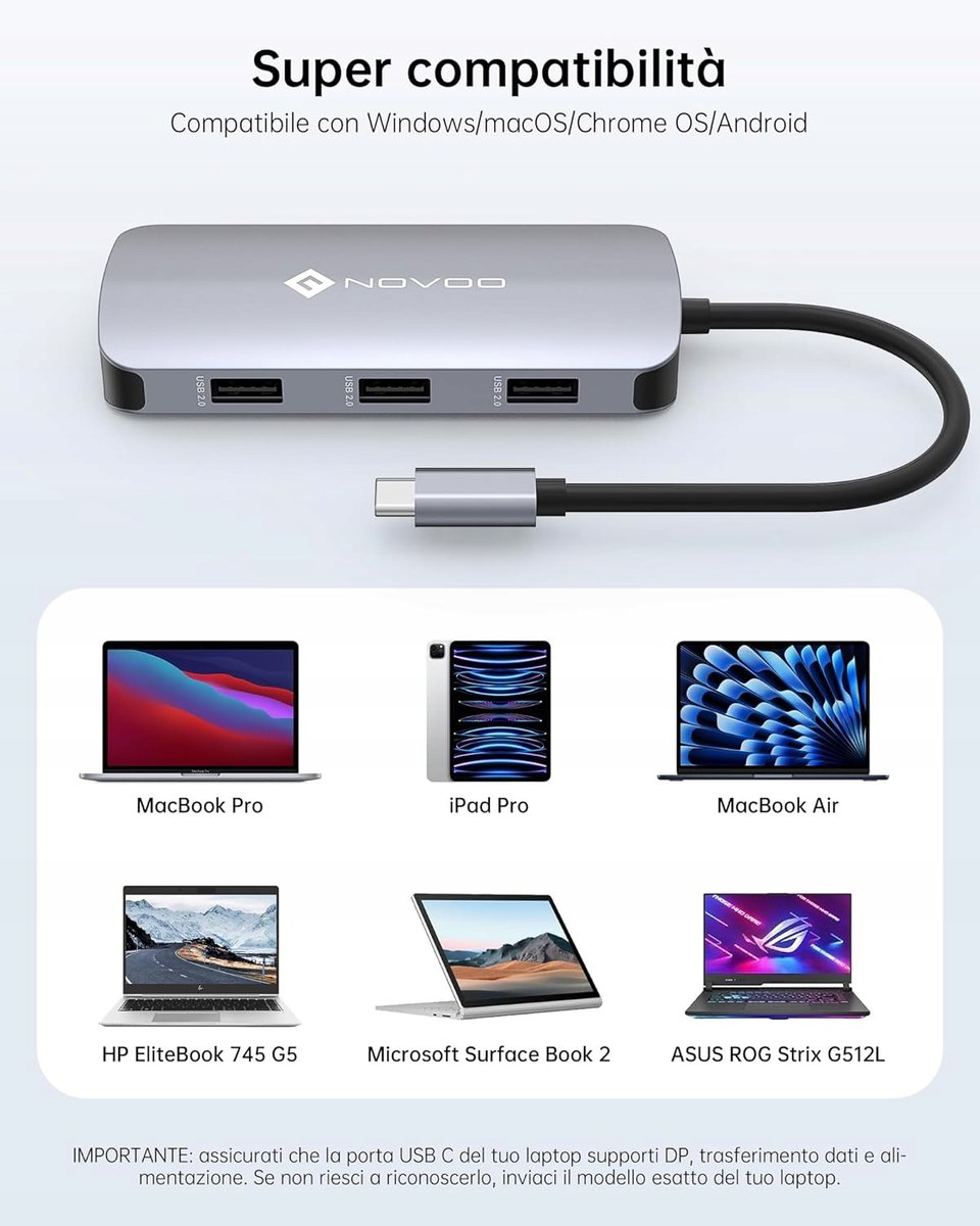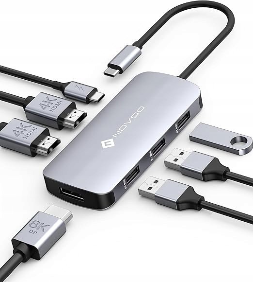 Stacja dokująca USB C z trzema wyświetlaczami, adapter NOVOO 7 w 1 do dwóch monitorów laptopów, pojedynczy DP 8K@30Hz, podwójny HDMI 4K@60Hz, 3 porty USB A, PD 100 W do laptopów MacBook, Dell, HP, Lenovo