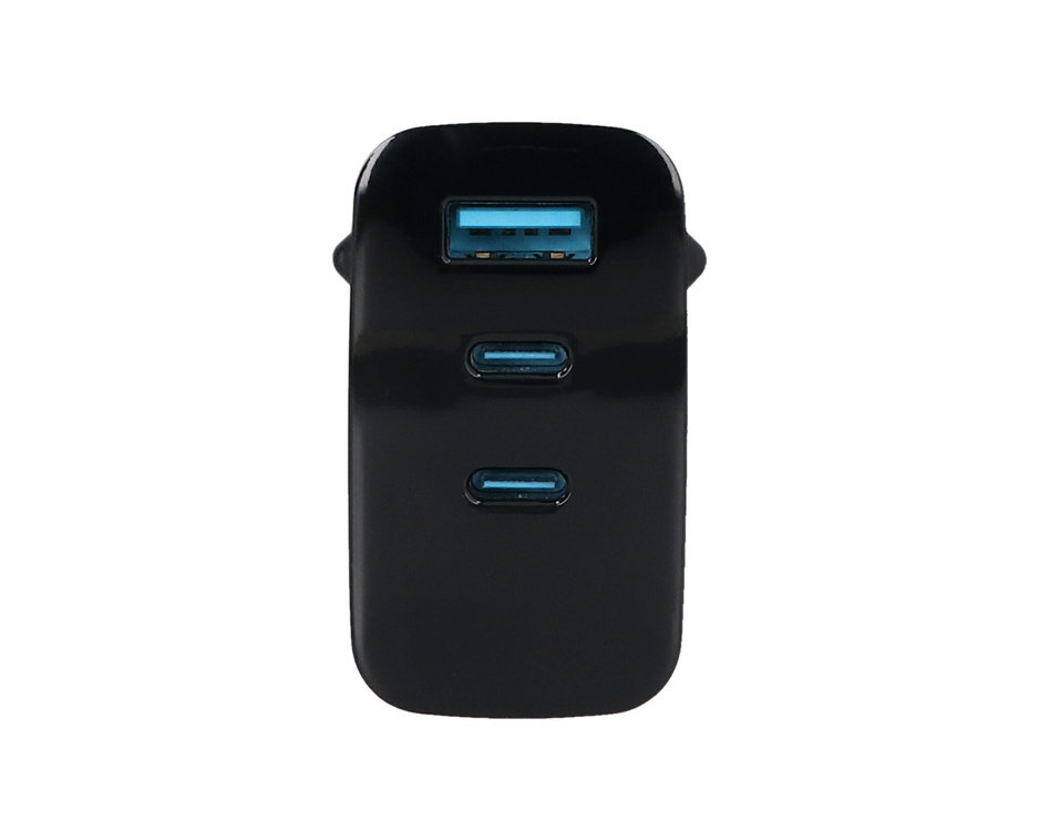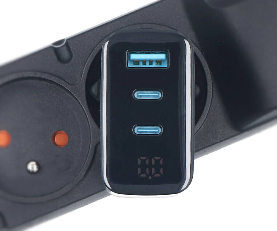 Szybka i mocna ładowarka sieciowa do telefonów, tabletów, papierosów elektronicznych i innych urządzeń. Jednocześnie możesz ładować trzy urządzenia. Dwa porty USB-C, jeden port USB-A i wyświetlacz informujący o poziomie naładowania gdy nasze urządzenie nie posiada takich danych.