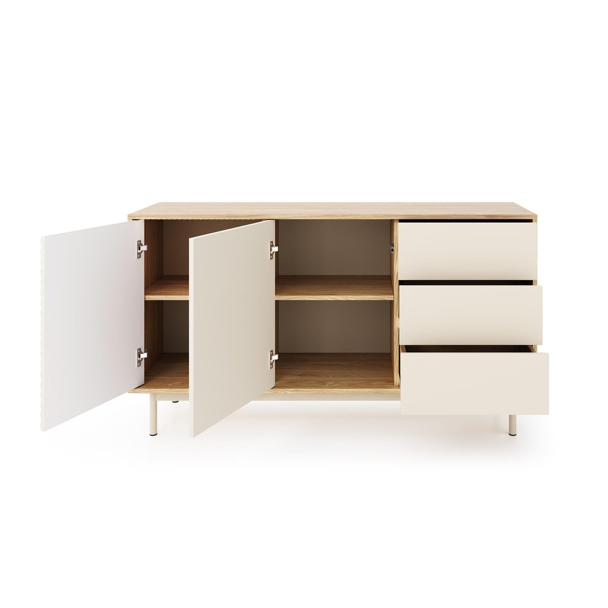Komoda LATILO to połączenie elegancji, funkcjonalności i nowoczesności, idealna do każdego wnętrza. Jej front w subtelnym kolorze kaszmiru doskonale kontrastuje z korpusem oraz półkami w ciepłym odcieniu dębu olejowanego, tworząc harmonijną całość. Mebel wyposażony jest w dwa drzwi, z których jedno jest ryflowane, oraz trzy przestronne szuflady, które umożliwiają wygodne przechowywanie różnych przedmiotów.