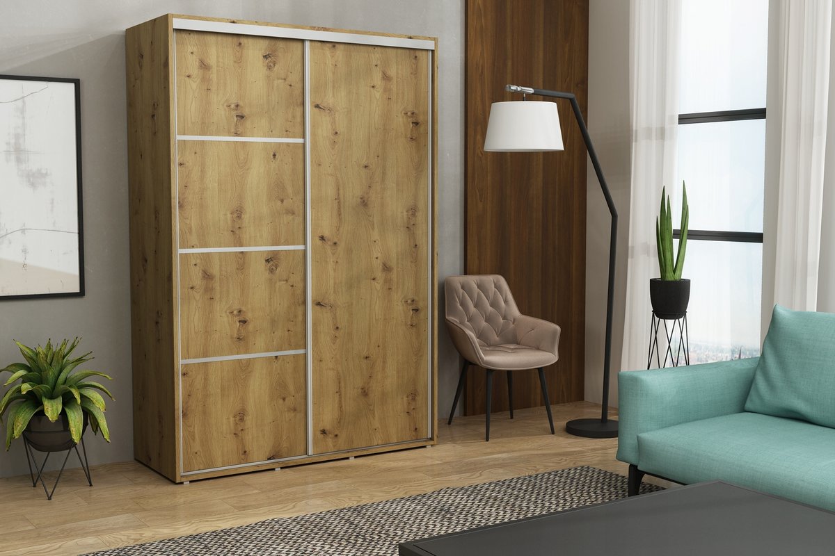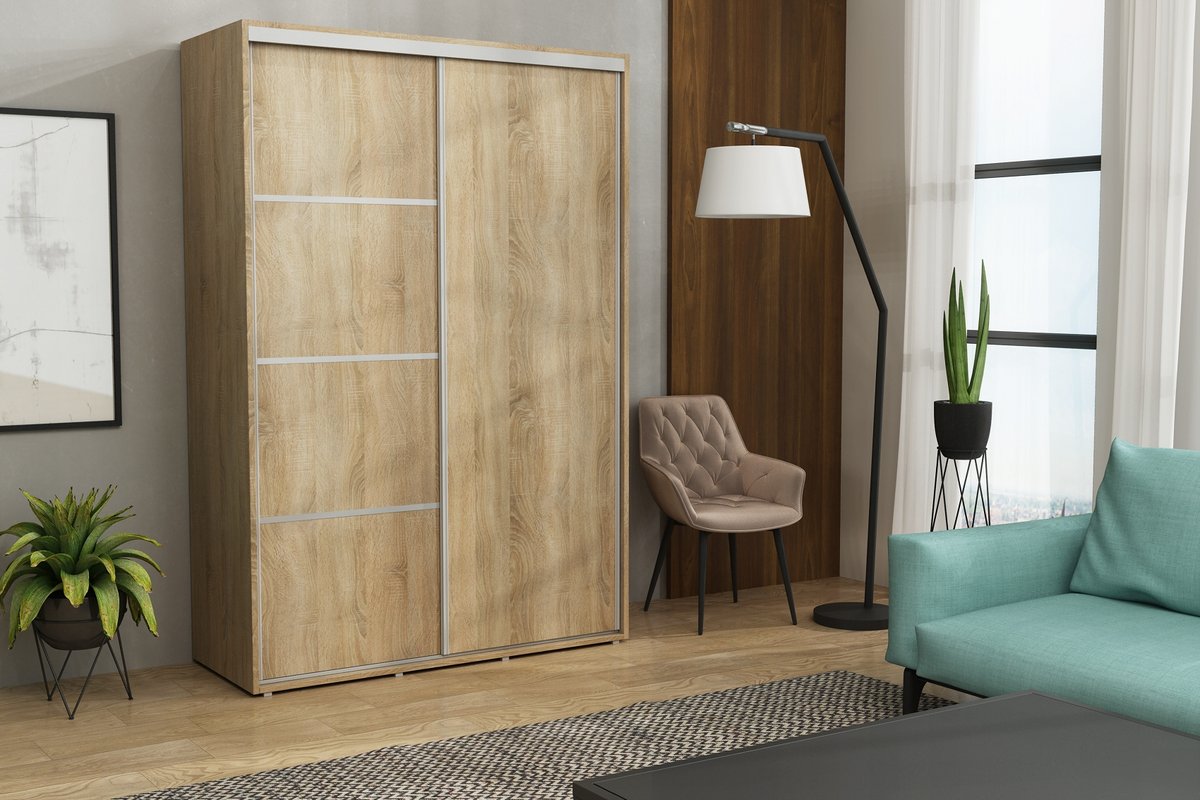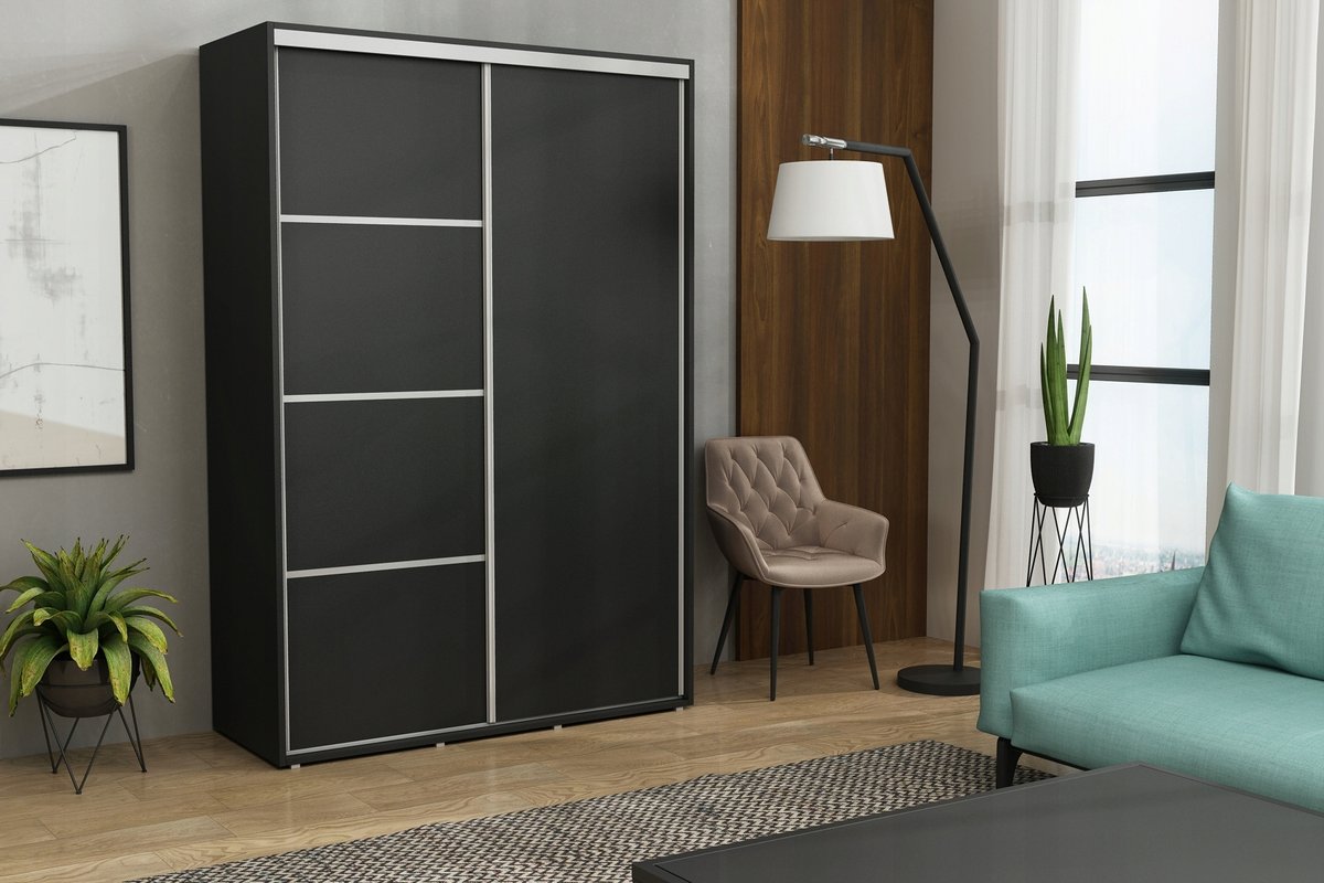 Szafa przesuwna Kacper Slim to idealne rozwiązanie dla osób poszukujących funkcjonalnego i stylowego mebla do przechowywania ubrań i akcesoriów . Jej wyjątkowy design z frontami podzielonymi paskami w kolorze aluminium , nadaje wnętrzu nowoczesnego charakteru.