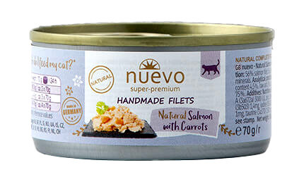 Nasza naturalna karma, Nuevo Handmade łosoś z marchewką jest bogata w kwasy tłuszczowe omega-3, które zawierają wiele korzyści zdrowotnych dla twojego kota. Przyczynia się do błyszczącej, zdrowej sierści i wspiera system odpornościowy. Dodatkowo, witaminy i minerały zawarte w galaretce sprawiają, że twój kot otrzymuje wszystkie niezbędne składniki odżywcze przez cały dzień, aby prowadzić aktywne i zdrowe życie.