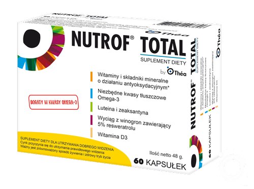 Nutrof Total z witaminą D3 to preparat w kapsułkach, zawiera witaminy i mikroelementy (witamina C i E, cynk, miedź, selen, o działaniu antyoksydacyjnym oraz cynk, który przyczynia się do utrzymania prawidłowego widzenia. Sprawdza się u osób borykających się ze zmęczeniem oczu, spowodowanym przez długotrwałe wpatrywanie się w ekran komputera czy telewizora, polecany jest też przy nieprawidłowej diecie ubogiej w warzywa, owoce i ryby oraz spożywaniu dużej ilości napojów procentowych. Nutrof Total z witaminą D3 pomaga przeciwdziałać stresowi oksydacyjnemu, zawiera glutation, który ma działanie przeciwutleniające. Luteina krystaliczna (FloraGlo Lutein) i zeaksantyna (barwniki plamki żółtej), pełnią funkcję filtrów ochronnych. Kwasy tłuszczowe Omega-3 (DHA) wpływają na lepszą jakość widzenia, a resweratrol wspiera funkcjonowanie naczyń krwionośnych oka oraz redukuje ciśnienie krwi.