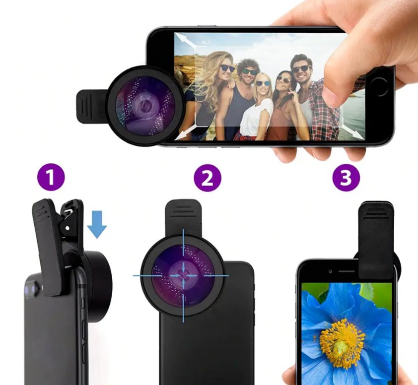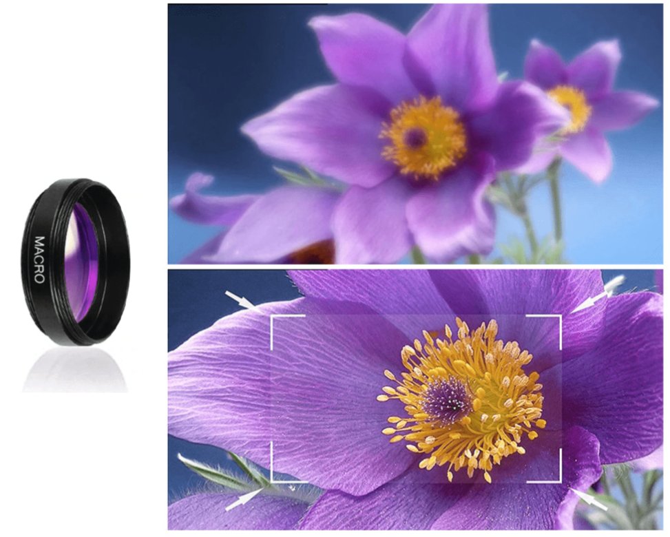 Obiektyw 12,5x umożliwia fotografowanie malutkich obiektów z niesamowitą szczegółowością. Ten obiektyw może skupiać się odległością od 3 do 6 centymetrów od obiektu. Uniwersalny uchwyt zaciskowy dla szerokokątnego obiektywu makro do telefonu jest kompatybilny z obiektywami o średnicy 37 mm i pasuje do większości modeli smartfonów o średnicy obiektywu nie większej niż 13 mm.