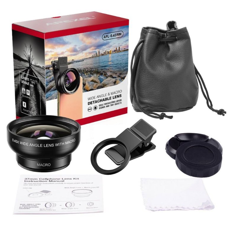 Apexel APL-0.45WM to kombinowany obiektyw do telefonu składający się z makroobiektywu i szerokokątnego obiektywu o jakości HD. Do produkcji tego akcesorium wykorzystuje się optyczne szkło o wysokiej przepuszczalności światła i powłoce zapobiegającej pojawianiu się niepożądanych odblasków. Aluminium obudowy zwiększa trwałość i odporność na zużycie obiektywu.