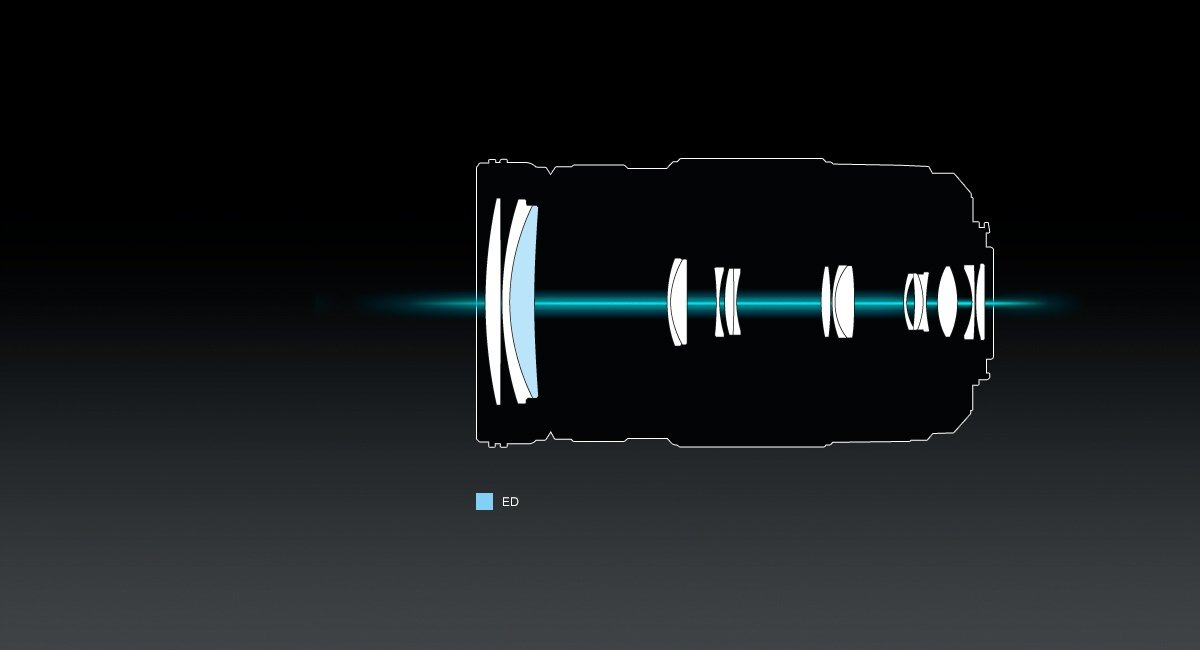17 elementów w 12 grupach – 1 soczewka Extra-Low Dispersion Soczewki Extra-Low Dispersion (ED) korygują aberracje chromatyczne, zapewniając ostry i kontrastowy obraz z czystymi kolorami na całej powierzchni.