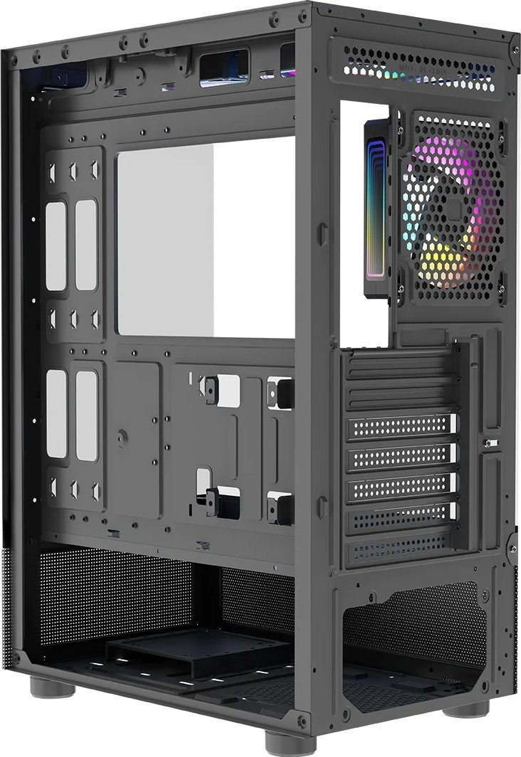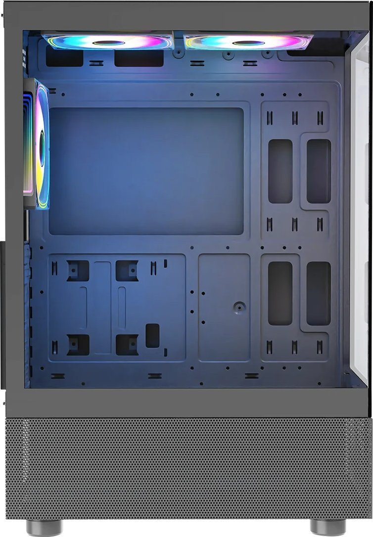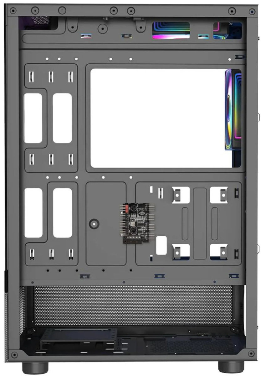 W obudowie zainstalowane zostały trzy 120 mm wentylatory ARGB. W celu zachowania jak najlepszego obiegu powietrza wentylator zamontowany z tyłu wyciąga gorące powietrze. Tak samo pracuje również jeden z wentylatorów na górze tuż nad procesorem. Drugi z kolei - ten zamontowany najbliżej panelu przedniego - wtłacza zimne powietrze do środka. Dzięki takiemu systemowi pracy, trzy wentylatory w najlepszy możliwie sposób chłodzą wnętrze komputera. Front i bok obudowy na wysokości tunelu zasilacza jest perforowany. Poprawia to wentylację całej konstrukcji zapewniając lepszy obieg powietrza, a tym samym możliwie najniższe temperatury. Dzięki perforacjom montaż dodatkowych dwóch 120 mm wentylatorów na wysokości tunelu zasilacza przyczynia się w jeszcze lepszym stopniu do schłodzenia pracy całego komputera. Obudowa przystosowana jest również do montażu chłodzenia wodnego. Na górze obudowy można zainstalować chłodnice w rozmiarach 120 mm / 240 mm.Gotowa na gamingowe komponenty
