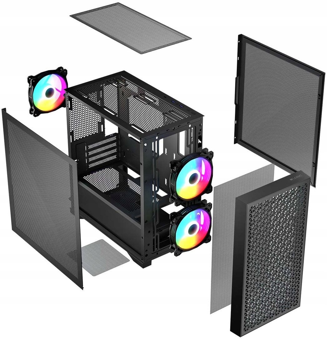 - Dodatkowe informacje: Filtry antykurzowe, Kontroler / hub wentylatorów, Siatkowy panel boczny, Siatkowy panel górny, Tunel na zasilacz, Wyjmowana klatka HDD, Zdejmowany boczny panel