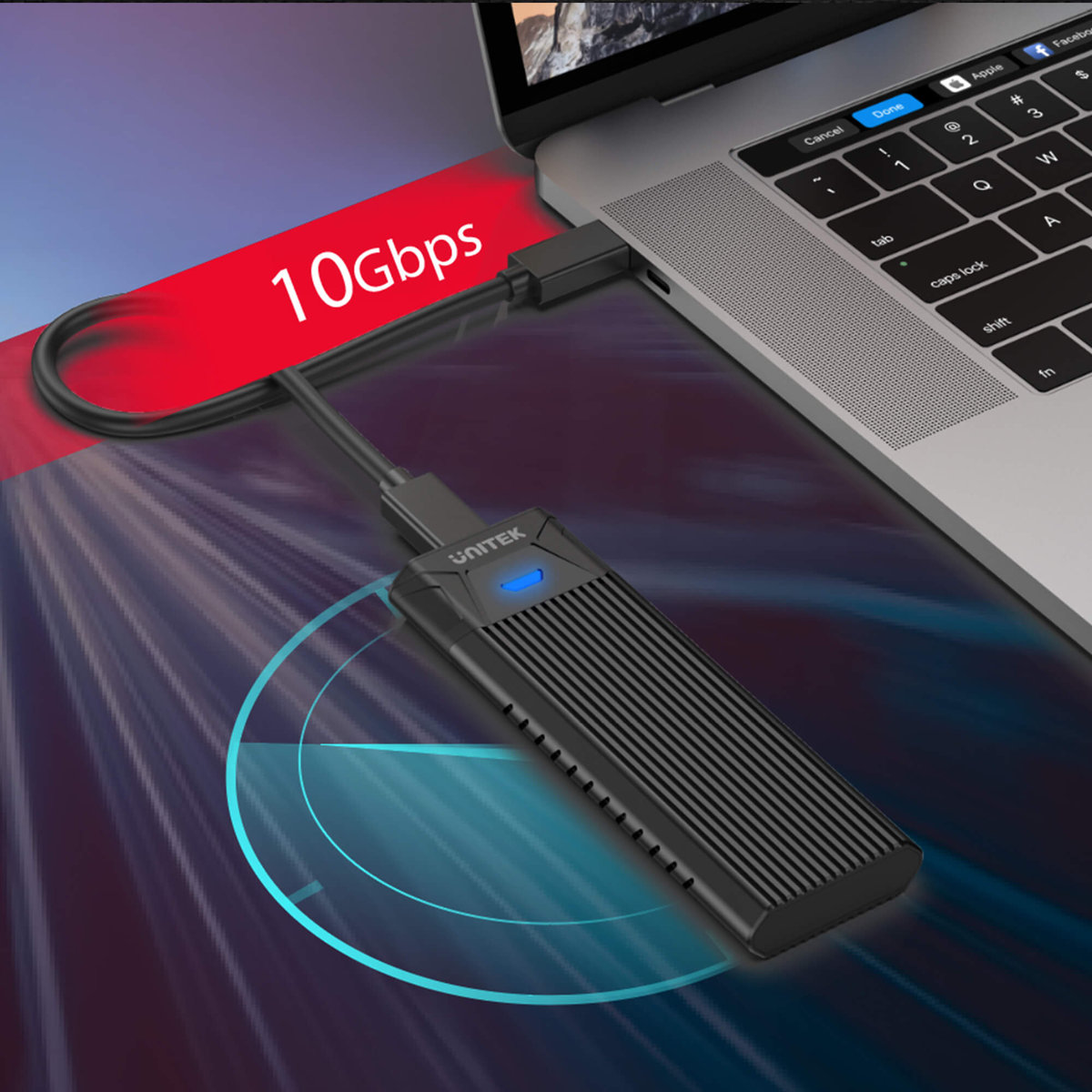 Obudowa Unitek S1203A z interfejsem USB 3.1 Gen2 umożliwia montaż pamięci SSD M.2 i podpięcie jej do komputera lub tabletu.