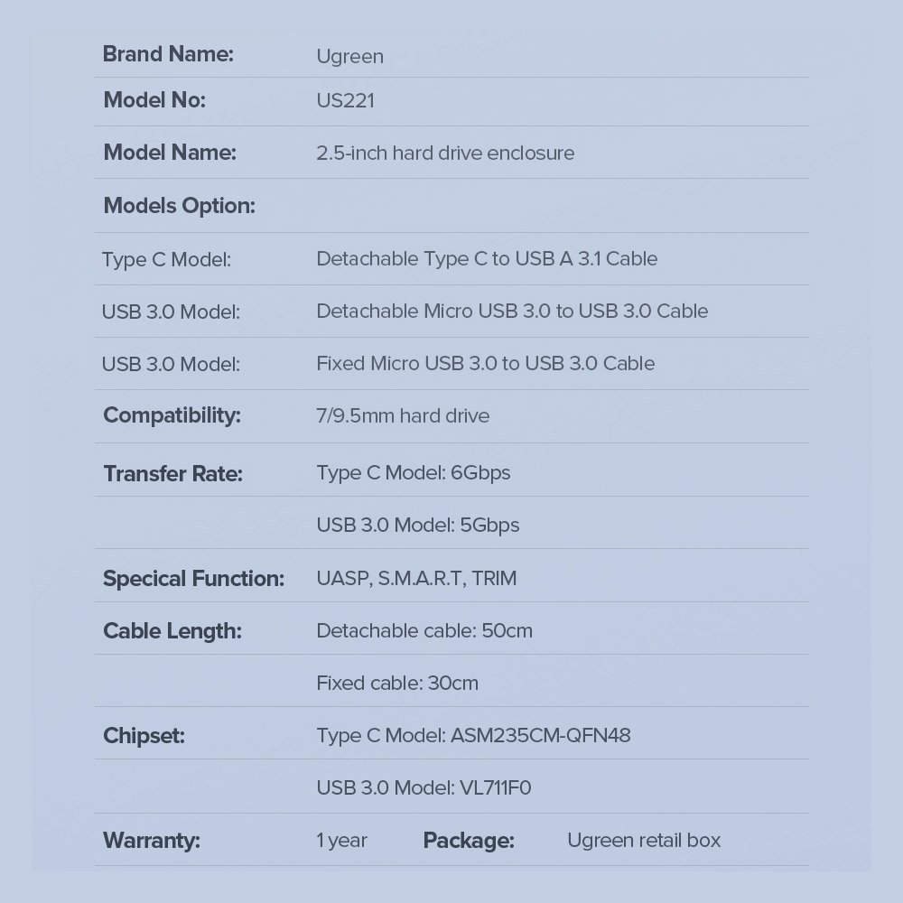 | Nazwa: | Obudowa zewnętrzna dysku HDD/SSD 2,5" UGREEN US221, SATA, USB 3.0 + USB-C do USB-C 3.1 |