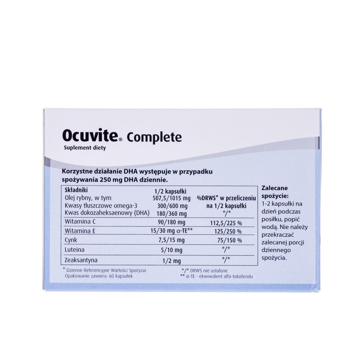 Ocuvite Complete to suplement diety w postaci kapsułek, który zawiera luteinę, zeaksantynę, kwasy omega-3, witaminy C i E, a także cynk. Produkt przeznaczony dla osób dorosłych.