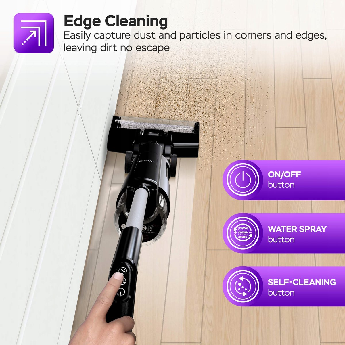 TT-AIV8 radzi sobie nie tylko na środku pokoju, ale również wzdłuż ścian i przy listwach. Dzięki funkcji spray skutecznie rozpuszcza i usuwa nawet zaschnięte zabrudzenia.