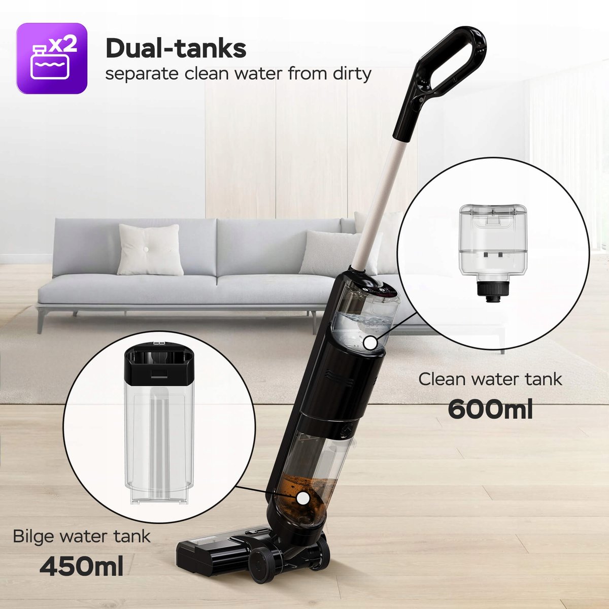 System dwóch zbiorników: 600 ml na czystą wodę i 450 ml na brudną wodę. Oddzielone komory gwarantują higieniczne czyszczenie i brak przykrych zapachów.