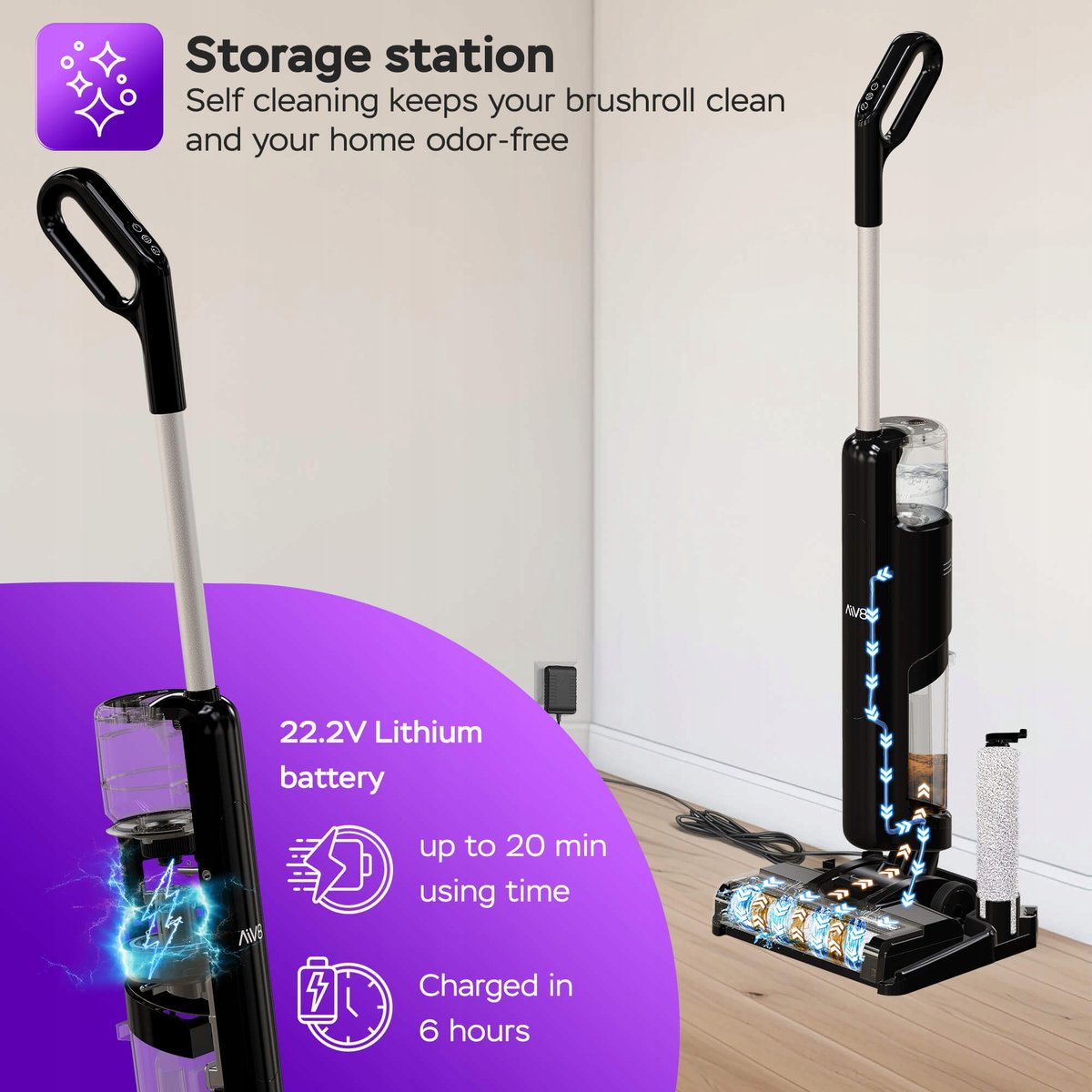 Baza pełni funkcję stojaka i stacji ładowania, a także systemu auto-czyszczenia. Szczotka zostaje wypłukana i gotowa do kolejnego sprzątania – bez brudu, bez zapachów.
